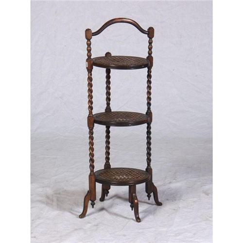 STAND: Circa 1900 oak and cane three tier stand, barley twist posts on cabriole legs. 37''h x 13''d x 12''w