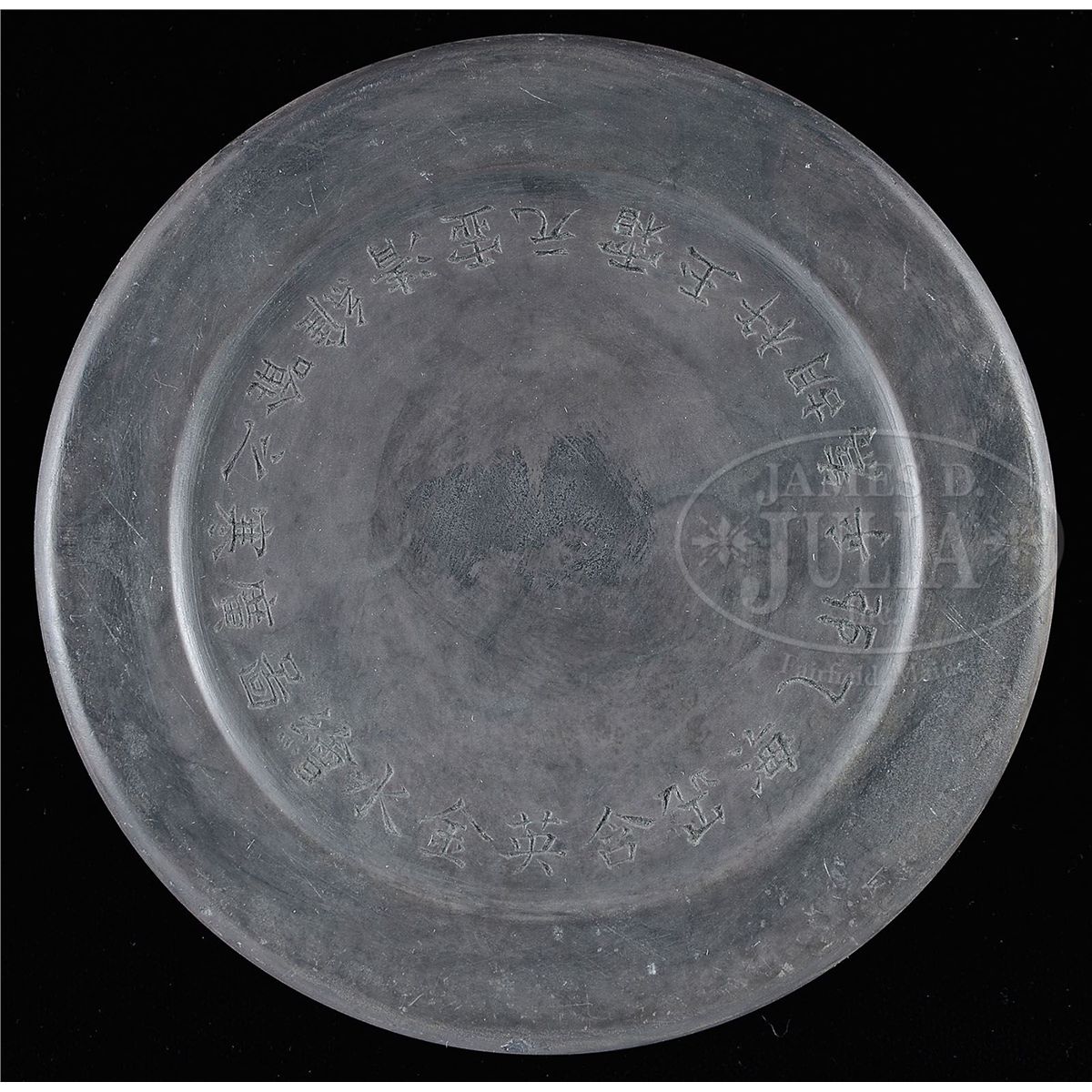 19th century, China. The purple stone with extensive inscriptions on the base. SIZE: 5" dia. CONDITION: Very good. 9-90789