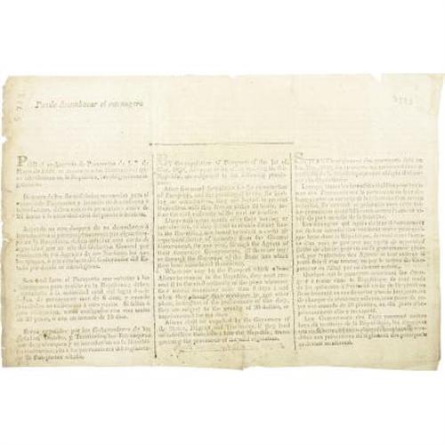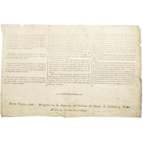 <B>[Circular] Passport Regulations Printed by Samuel Bangs.</B></I> Leona Vicario [Saltillo]: Samuel Bangs , 1828. One page, two sided, in Spanish, English, and French, 11.75 x 7.5". With heading: <I>Puede Desembacar El Estrangero</B></I>. Foreigners arriving in the state of Coahuila y Texas had numerous hurdles to clear, whether visiting or intending to settle in the area. First, the applicant had to "prove, by certificate from the authorities of the place from whence they came, that they are Christians, and also the morality and propriety of their conduct." <BR><BR>Secondly, the applicant was required to carry passport papers at all times, and notify authorities of the location of their residence. This circular produced by noted printer Samuel Bangs, provides prospective visitors/settlers with important information about their movements in and around the state. It reads in part: <I>"...Aliens...must present [passport] to the civil authority of the place wherever they intend remaining more than 8 days; and when they change their residence to any other place, in neglect of the performance of this duty, they are subject to the penalty of 20 dollars, or imprisonment for ten days</B></I>." <BR><BR>To become a citizen, foreign settlers were required to appear before municipal authorities and swear to "abide by and obey the general Constitution, and that of the State; to observe the religion as stipulated by the former; and in a book (the register of foreigners) which shall be kept for that purpose, his name and those of the members of his family, if he has any, shall be set down; noting the country from whence he comes, whether married or single, his employment; and he having taken the requisite oath, shall be considered thenceforward, and not before that time, a fellow-citizen."<BR><BR>An important Bangs document - very rare and desirable. Brown half-calf case with gilt lettering. Silked at two edges, else fine. <I>From the collection of Darrel Brown.</B></I><BR><BR><B>Reference:</B></I> Streeter 733, only 2 copies. Eberstadt 162:51, this being the Eberstadt copy.<BR><BR><b>Shipping:</b> Books & Catalogs (<a target="_blank" href="http://www.heritageauctions.com/common/shipping.php">view shipping information</a>)
