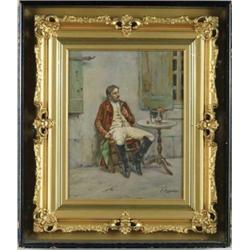 Lot # 83 CIRO COZZOLINO (Italian, Early 20th Century) OUTSIDE THE TAVERN. Oil on canvas scene shows a gentleman smoking from a pipe in chair seated outside a building with open window and shutter. A small round candlestand with brandy decanter, glass and coffee atop along with his black hat and gloves. Signed lower right “C. Cozzolino”. Housed in a fine gilt gesso decorated frame which is housed in a glass front black wood shadowbox. OUTSIDE SIZE: 22” x 19”. PAINTING: 14” x 11”. CONDITION: Very good. 9-99419 (900-1,200)