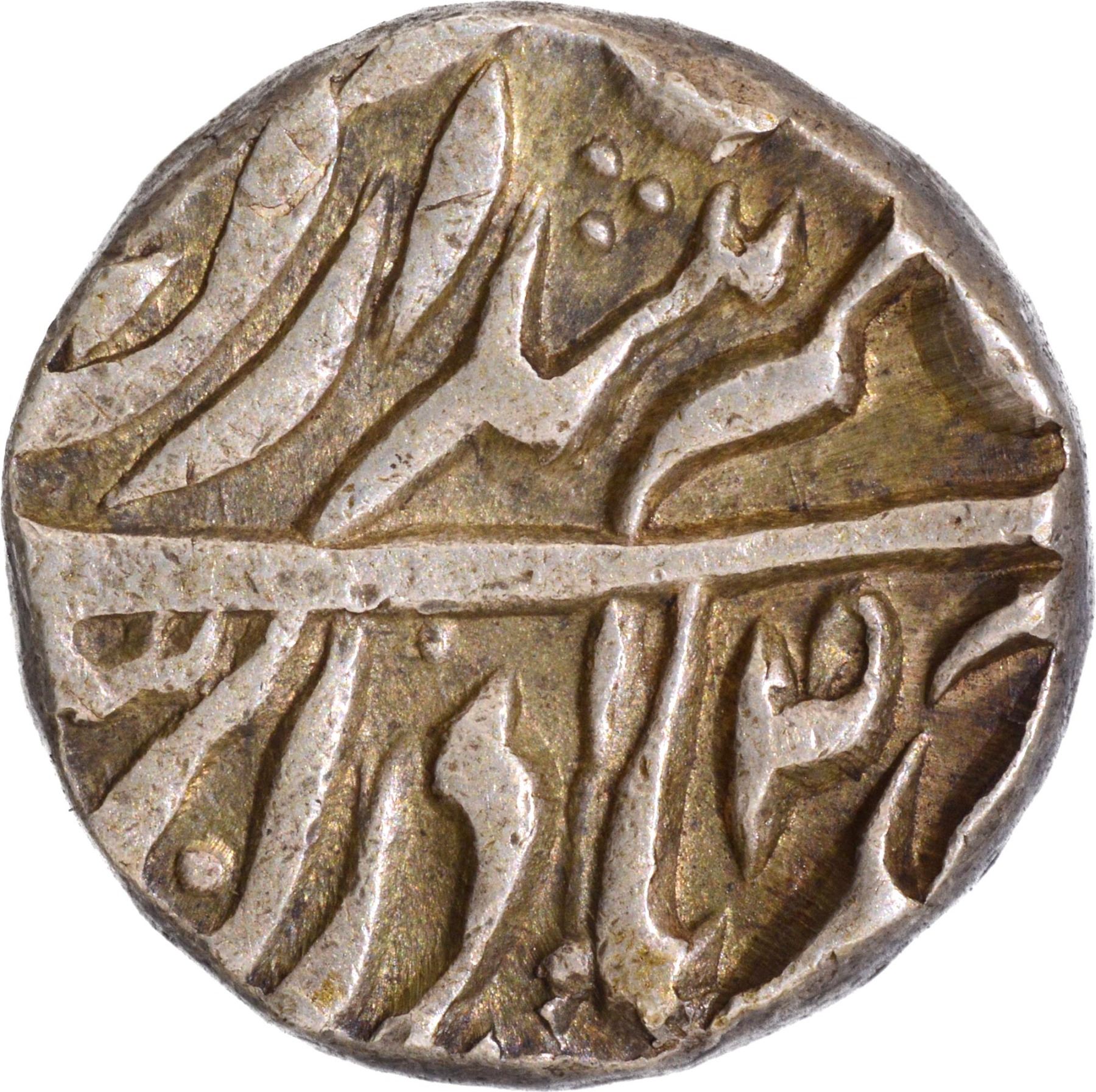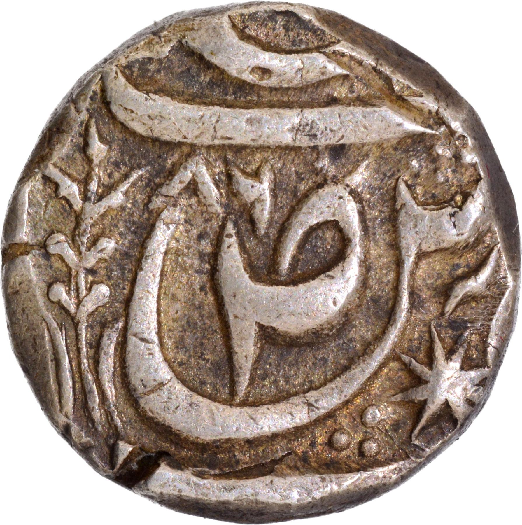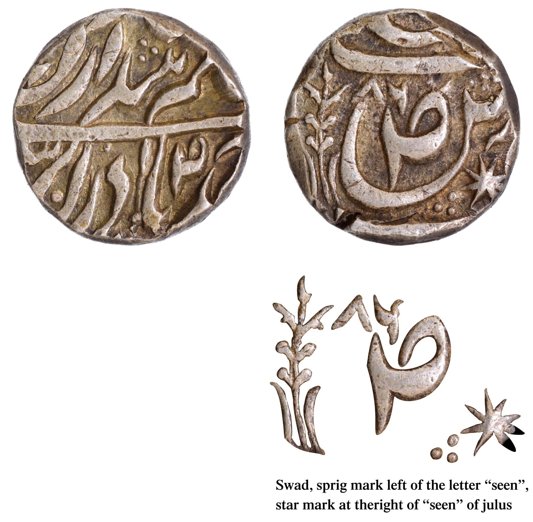 CIS-Nabha, Jaswant Singh (VS 1840-1897 /1783-1840 AD), Sahrind Mint (off flan), Silver Rupee, VS (18)86 (1829 AD), "Qadir-e-Bechun" Couplet, In the name of Ahmad Shah Durrani, Obv: Persian legend "hukm shud az Qadir-e-Bechun ba Ahmad Badshah, Sikka-e-zan bar seem-o-zar az auj mahi ta bamah", Rev: a symbol of "swad" in Persian letter 'seen' of julus, sprig mark left of the letter "seen", Star mark at the right of "seen" of julus & "zarb Sahrind" off flan at the bottom, 11.00g, 17.70mm, (Saran & Dalwinder # NB7ga), a gash on the edge, about very fine, Very Rare.