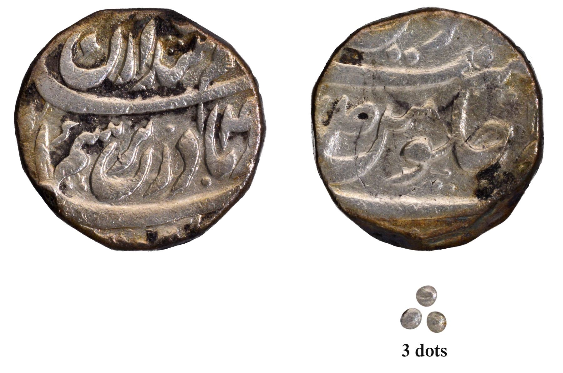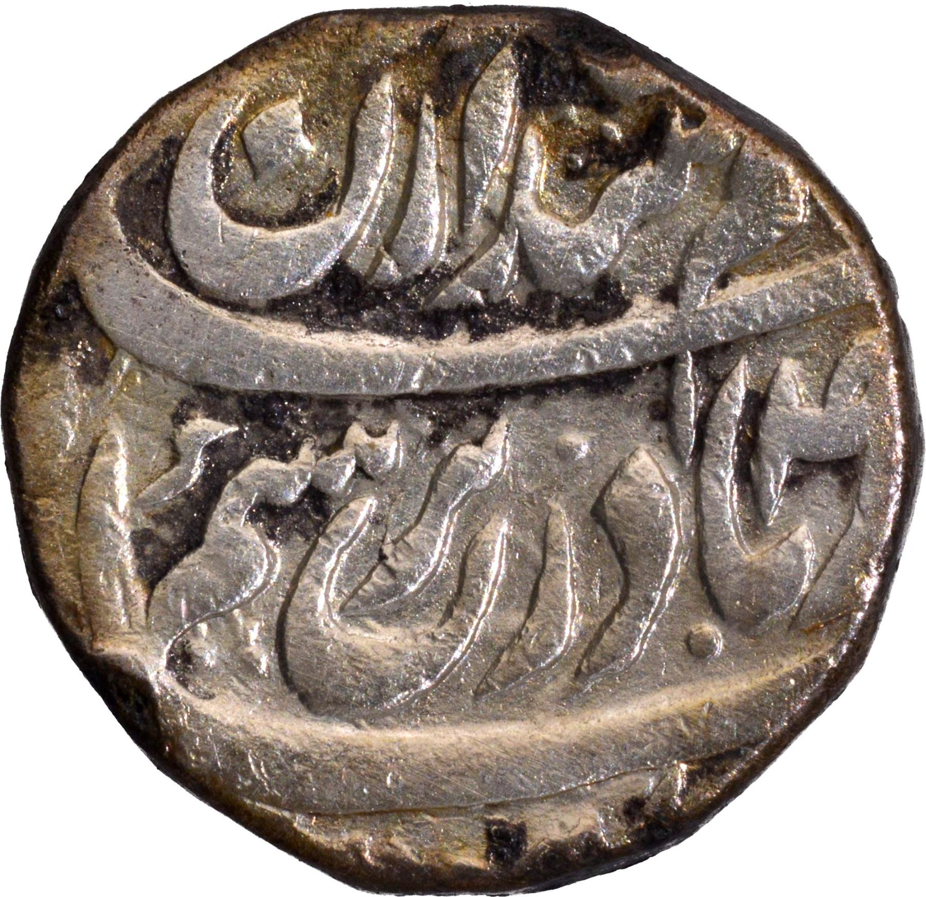 CIS-Patiala, Ala Singh (1753-1765 AD), Sahrind Mint (off flan), Silver Rupee, 1x RY, 'Qadir-e-Bechun' Couplet, In the name of Ahmad Shah Durrani, Obv: Persian legend "hukm shud az qadir-e-bechun ba Ahmad Badshah, sikka-e-zan bar seem-o-zar az auj mahi ta bamah”, Rev: a symbol of "swad" in Persian letter 'seen' of Julus, 3 dots, "zarb Sahrind" off flan at the bottom, 11.10g, 19.55mm, (Unlisted in KM / Saran & Dalwinder # PT1a), a gash on the edge, about very fine, Very Scarce.