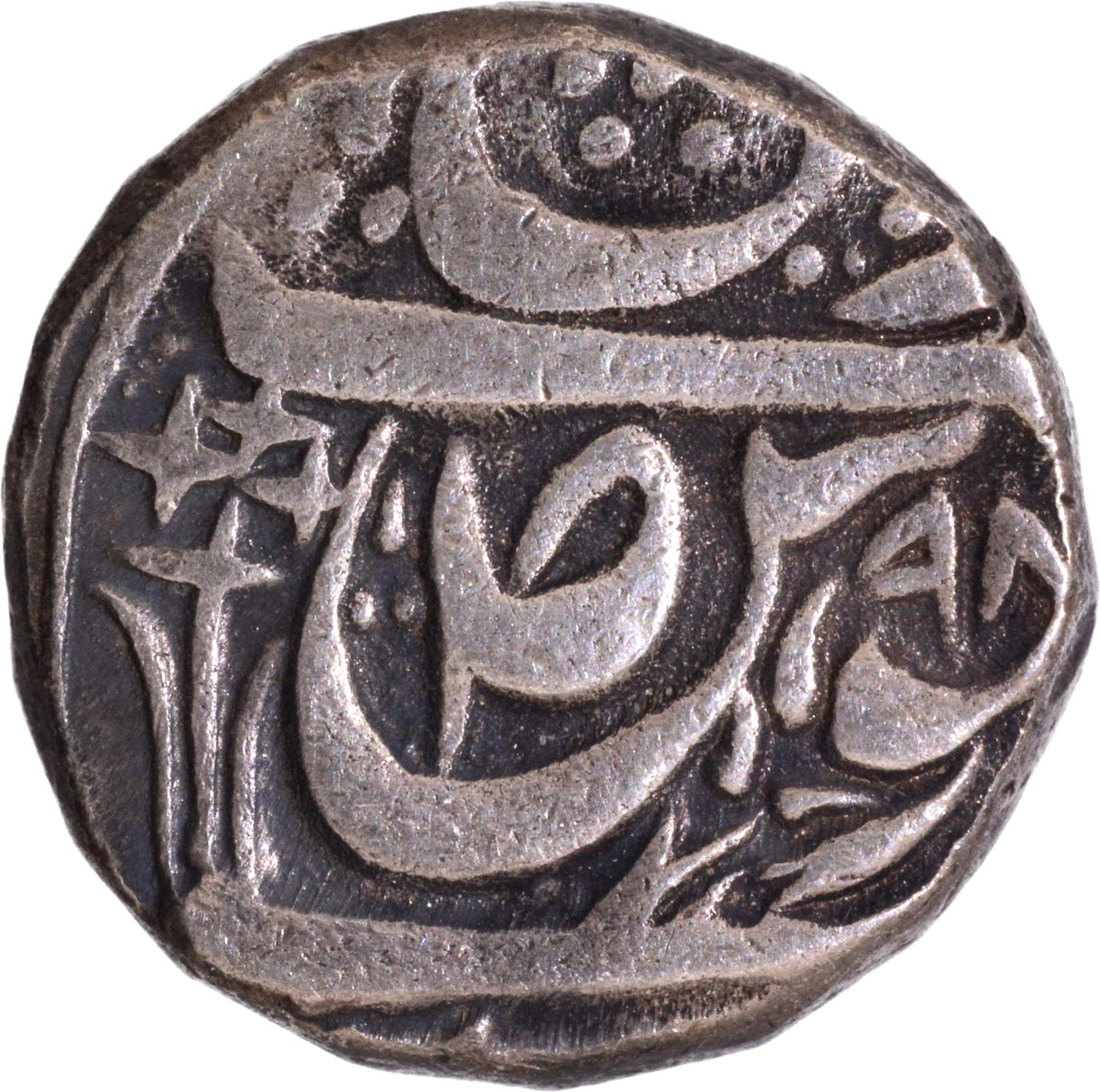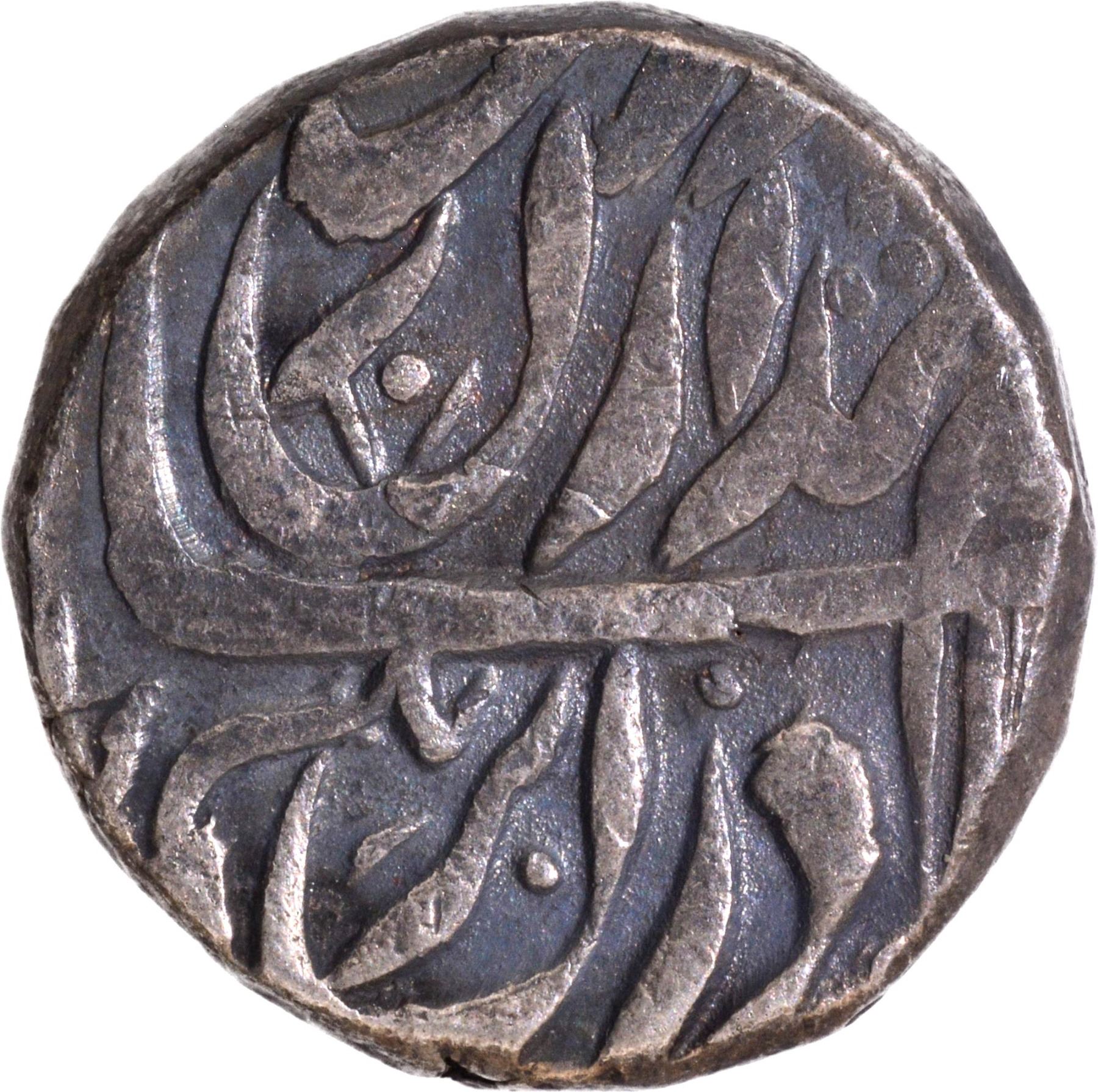 CIS-Patiala, Karam Singh (AH 1229-1261 /1813-1845 AD), Sahrind Mint (off flan), Silver Rupee, 'Qadir-e-Bechun' Couplet, VS (18)98 (1841), In the name of Ahmad Shah Durrani, Obv: Persian legend "hukm shud az qadir-e-bechun ba Ahmad Badshah, sikka-e-zan bar seem-o-zar az auj mahi ta bamah”, Rev: a symbol of "swad" in Persian letter 'seen' of Julus, a cross symbol at the left of ‘seen’ of ‘Julus’, Vikram Samvat year (18)98, "zarb Sahrind" off flan at the bottom, 10.9g, 18.14mm, (Unlisted in KM / Saran & Dalwinder # PT12Qb), about extremely fine, Very Scarce.