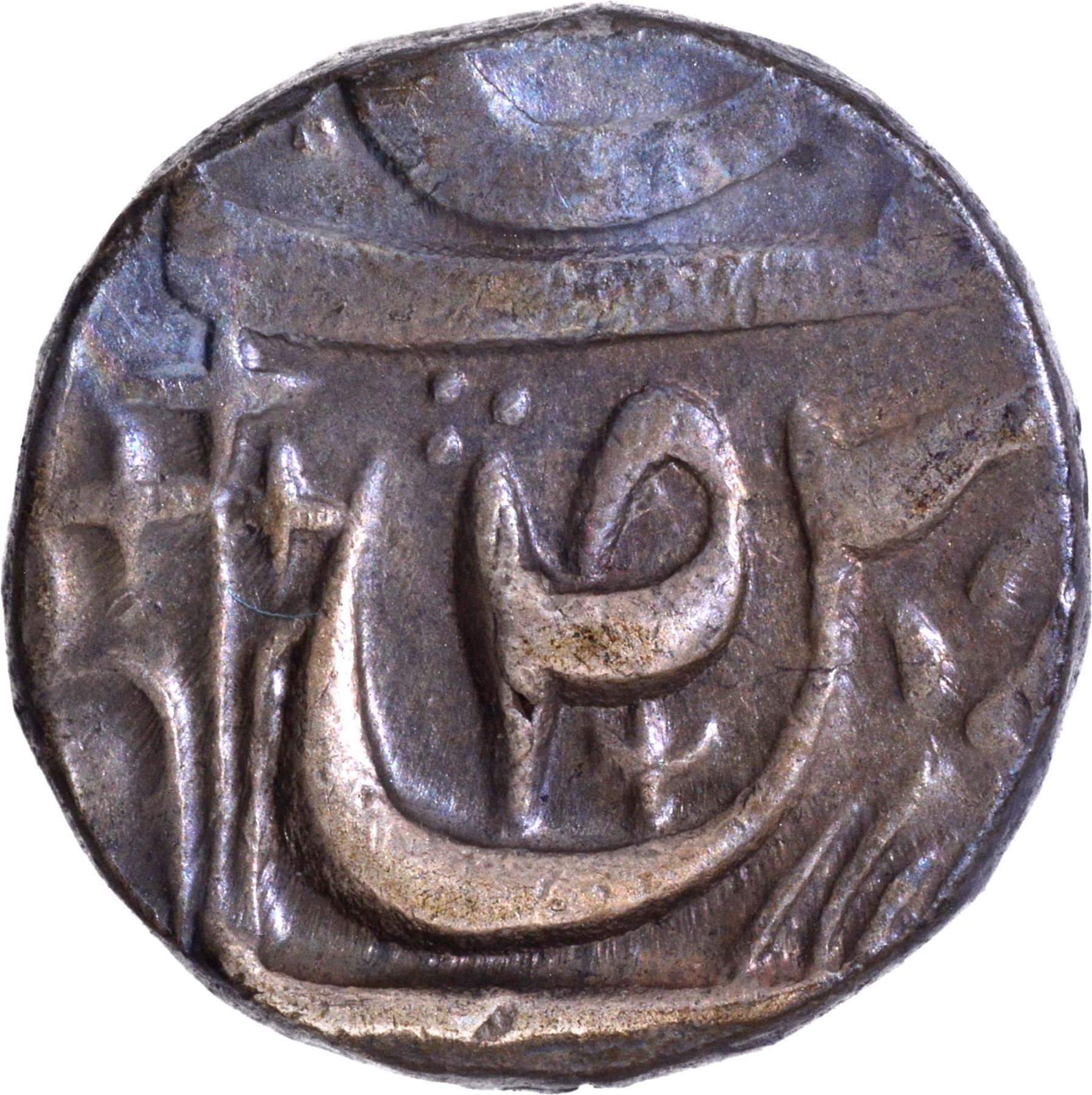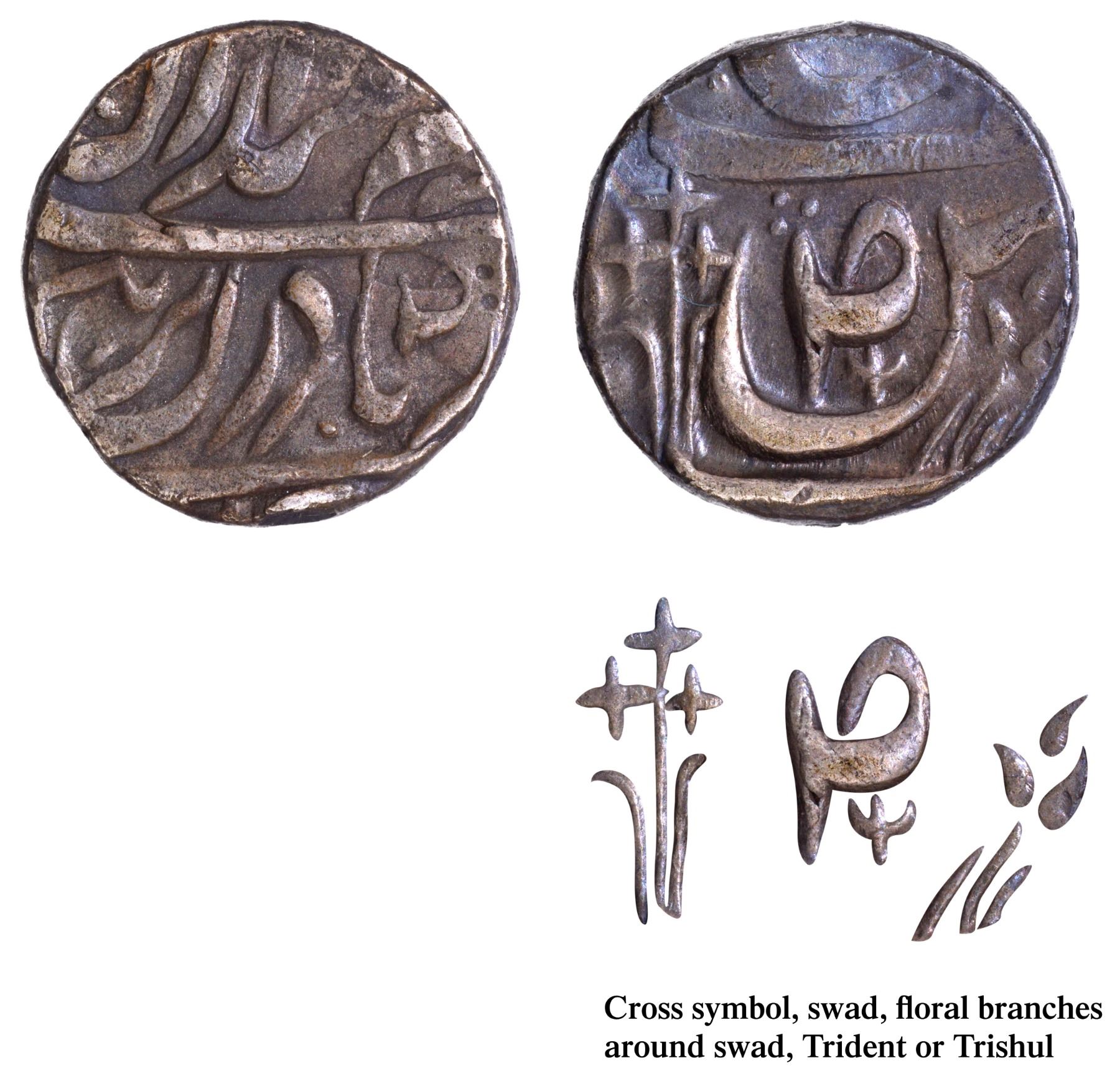 CIS-Patiala, Karam Singh (AH 1229-1261 /1813-1845 AD), Sahrind Mint (off flan), Silver Rupee, 'Qadir-e-Bechun' Couplet, In the name of Ahmad Shah Durrani, Obv: Persian legend "hukm shud az qadir-e-bechun ba Ahmad Badshah, sikka-e-zan bar seem-o-zar az auj mahi ta bamah”, Rev: a symbol of "swad" & Trident or Trishul in Persian letter 'seen' of Julus, cross symbol at the left of ‘seen’ of ‘Julus”, "zarb Sahrind" off flan at the bottom, 11.1g, 17.19mm, (Unlisted in KM / Saran & Dalwinder # PT12j), about extremely fine, Very Scarce.