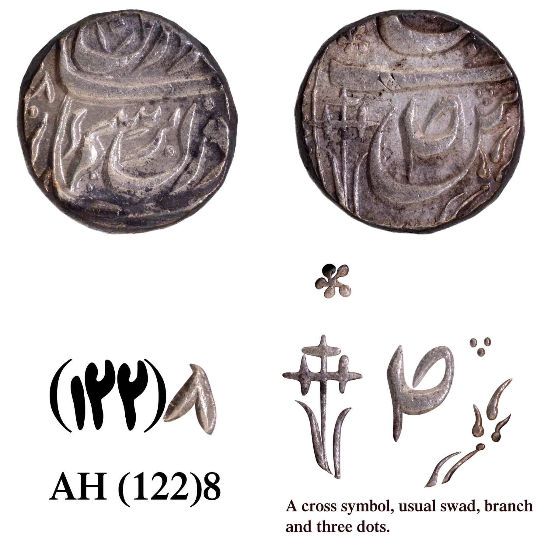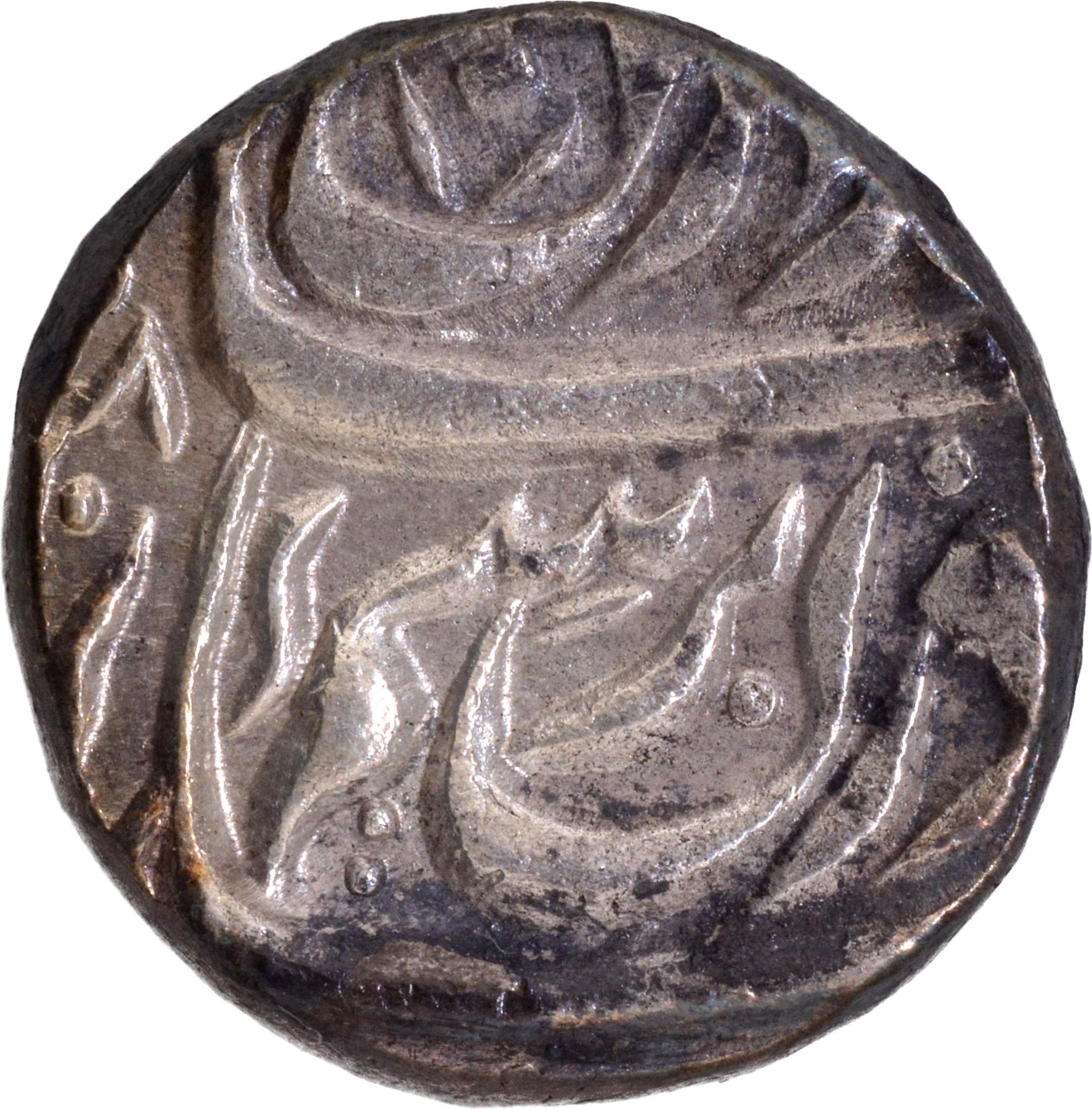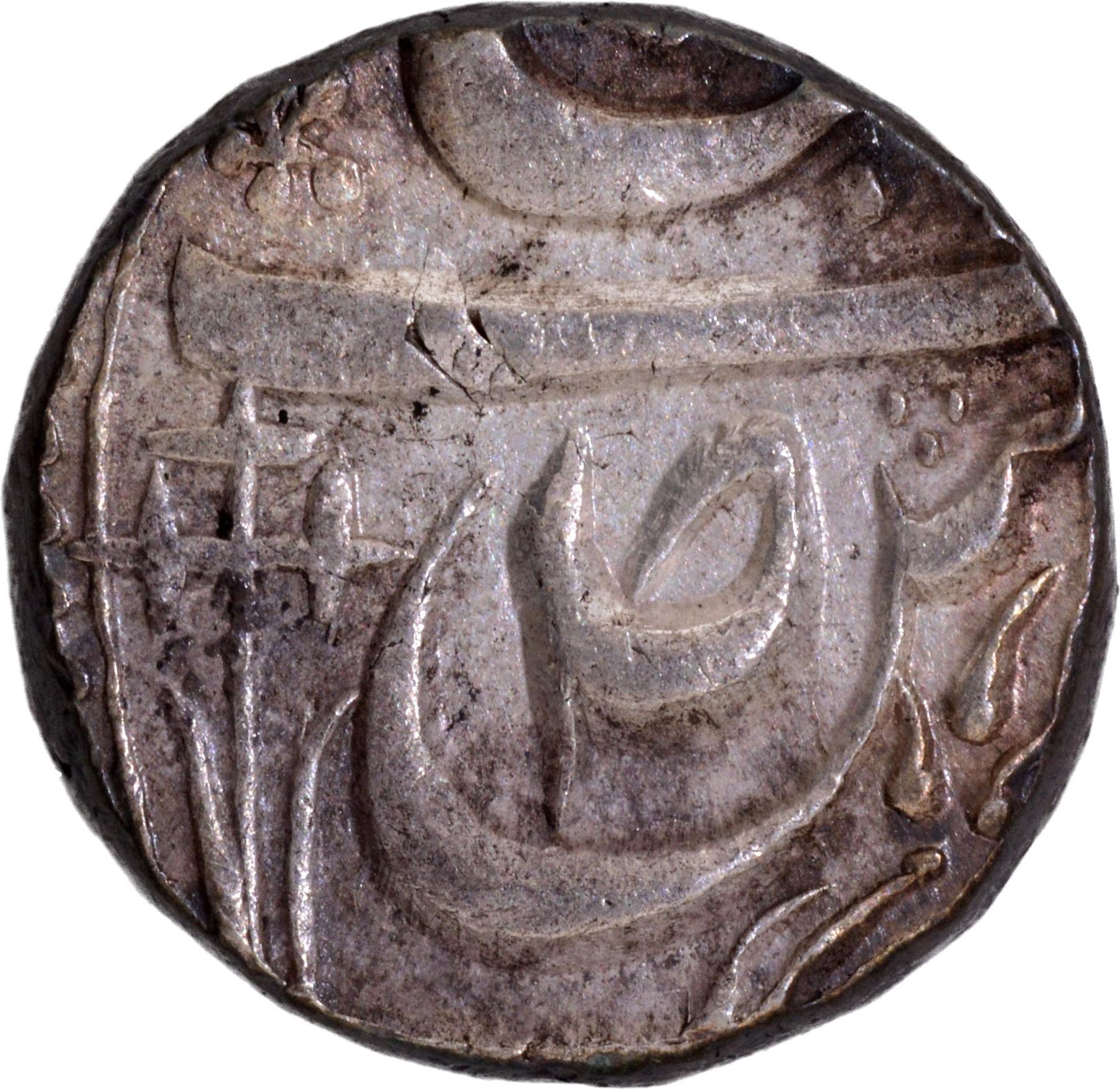 CIS-Patiala, Karam Singh (AH 1229-1261 /1813-1845 AD), Sahrind Mint (off flan), Silver Rupee, 'Qadir-e-Bechun' Couplet, AH (122)8, In the name of Ahmad Shah Durrani, Obv: Persian legend "hukm shud az qadir-e-bechun ba Ahmad Badshah, sikka-e-zan bar seem-o-zar az auj mahi ta bamah” with Hijri year (122)8, Rev: a symbol of "swad" in Persian letter 'seen' of Julus, a cross-like symbol at the left of ‘seen’ of ‘Julus’, 3 dots and branch right of ‘swad’, "zarb Sahrind" off flan at the bottom, 11.1g, 17.65mm, (Unlisted in KM & Saran & Dalwinder), sharp strikes, no test marks, about extremely fine, Very Rare.