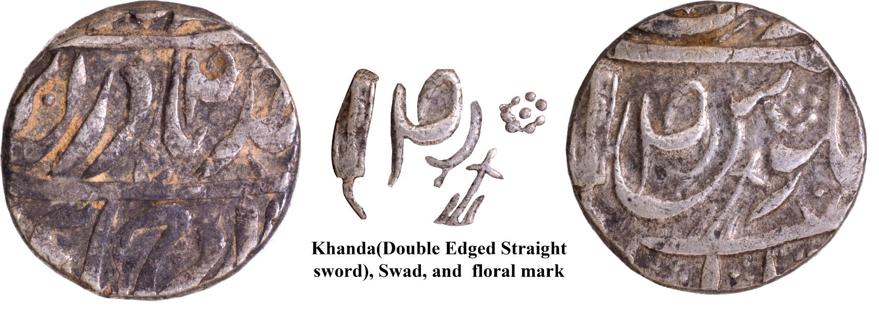 CIS-Patiala, Narinder Singh (VS 1902-1919 /1845-1862 AD), Patiala Mint (off flan), Silver Rupee, 'Qadir-e-Bechun' Couplet, VS (1903), In the name of Ahmad Shah Durrani, Obv: Persian legend "hukm shud az qadir-e-bechun ba Ahmad Badshah, sikka-e-zan bar seem-o-zar az auj mahi ta bamah”, Rev: a symbol of "swad" in Persian letter 'seen' of Julus, Khanda(Double Edged Straight sword) symbol at the left of ‘seen’ of ‘Julus’, Vikram Samvat year 1903 off flan above swad and floral mark, "zarb Patiala" off flan at the bottom, 11.0g, 18.20mm, (Unlisted in KM / Saran & Dalwinder # PT18ea), about extremely fine, Very Scarce.