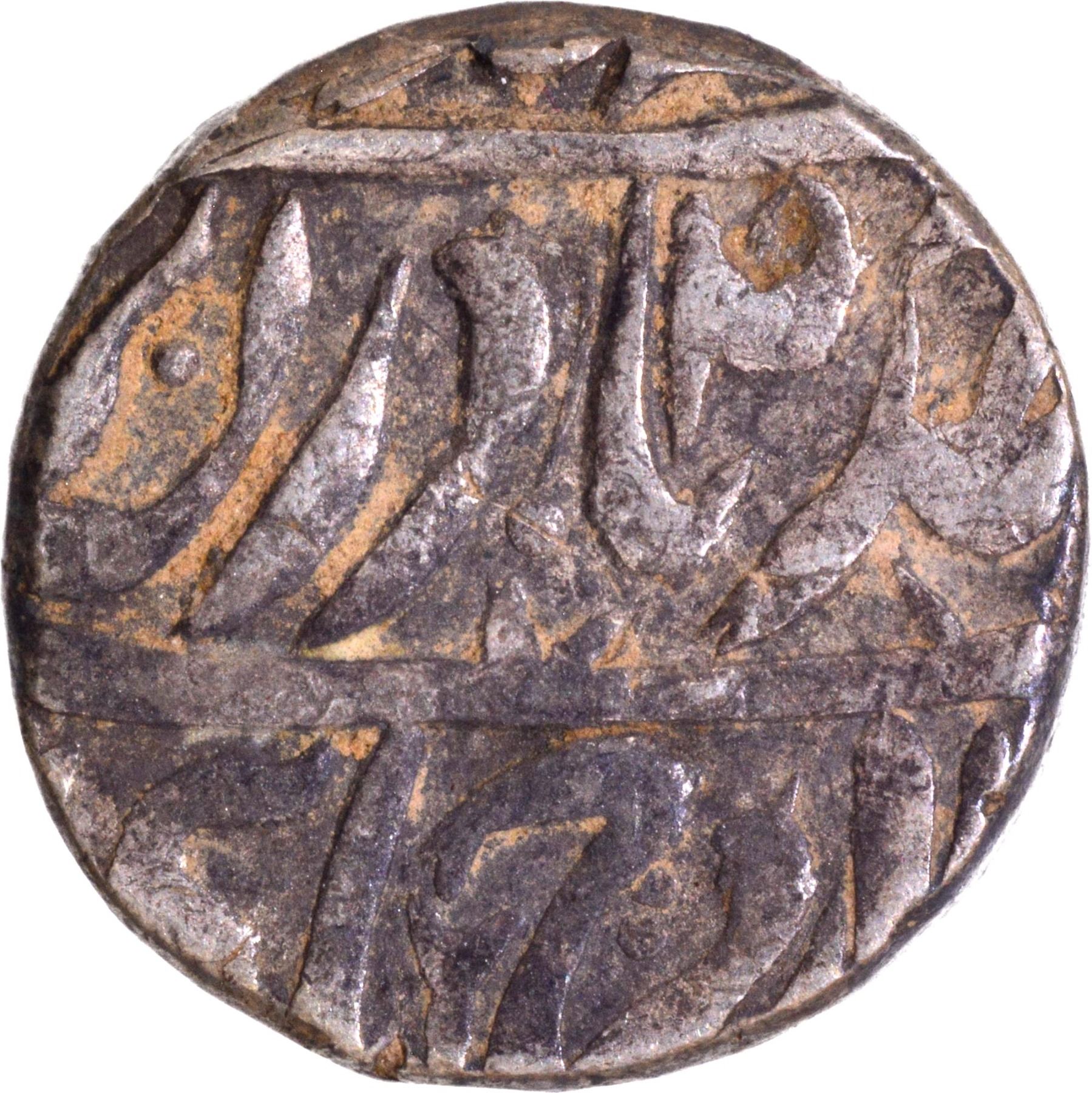 CIS-Patiala, Narinder Singh (VS 1902-1919 /1845-1862 AD), Patiala Mint (off flan), Silver Rupee, 'Qadir-e-Bechun' Couplet, VS (1903), In the name of Ahmad Shah Durrani, Obv: Persian legend "hukm shud az qadir-e-bechun ba Ahmad Badshah, sikka-e-zan bar seem-o-zar az auj mahi ta bamah”, Rev: a symbol of "swad" in Persian letter 'seen' of Julus, Khanda(Double Edged Straight sword) symbol at the left of ‘seen’ of ‘Julus’, Vikram Samvat year 1903 off flan above swad and floral mark, "zarb Patiala" off flan at the bottom, 11.0g, 18.20mm, (Unlisted in KM / Saran & Dalwinder # PT18ea), about extremely fine, Very Scarce.