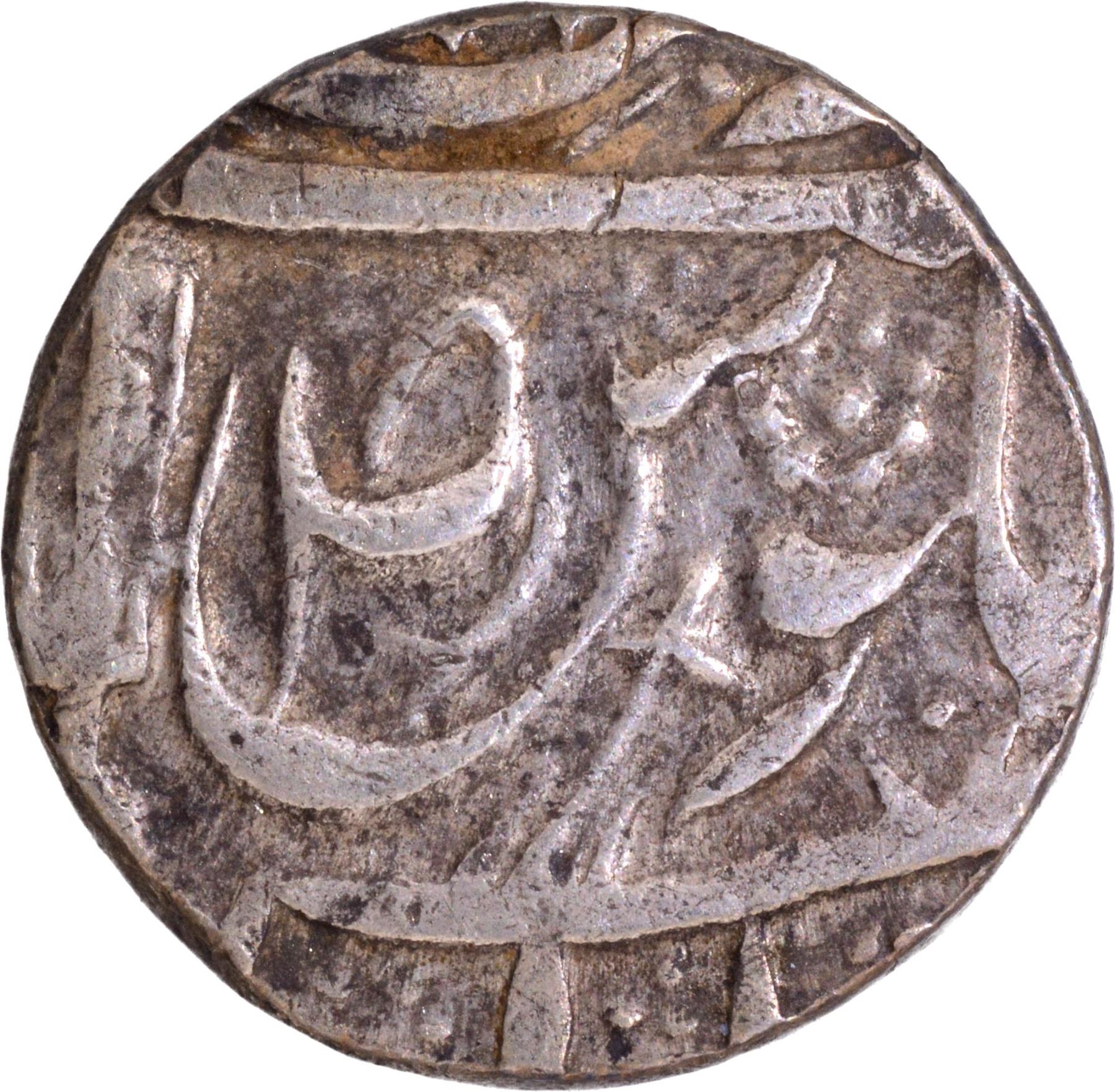 CIS-Patiala, Narinder Singh (VS 1902-1919 /1845-1862 AD), Patiala Mint (off flan), Silver Rupee, 'Qadir-e-Bechun' Couplet, VS (1903), In the name of Ahmad Shah Durrani, Obv: Persian legend "hukm shud az qadir-e-bechun ba Ahmad Badshah, sikka-e-zan bar seem-o-zar az auj mahi ta bamah”, Rev: a symbol of "swad" in Persian letter 'seen' of Julus, Khanda(Double Edged Straight sword) symbol at the left of ‘seen’ of ‘Julus’, Vikram Samvat year 1903 off flan above swad and floral mark, "zarb Patiala" off flan at the bottom, 11.0g, 18.20mm, (Unlisted in KM / Saran & Dalwinder # PT18ea), about extremely fine, Very Scarce.