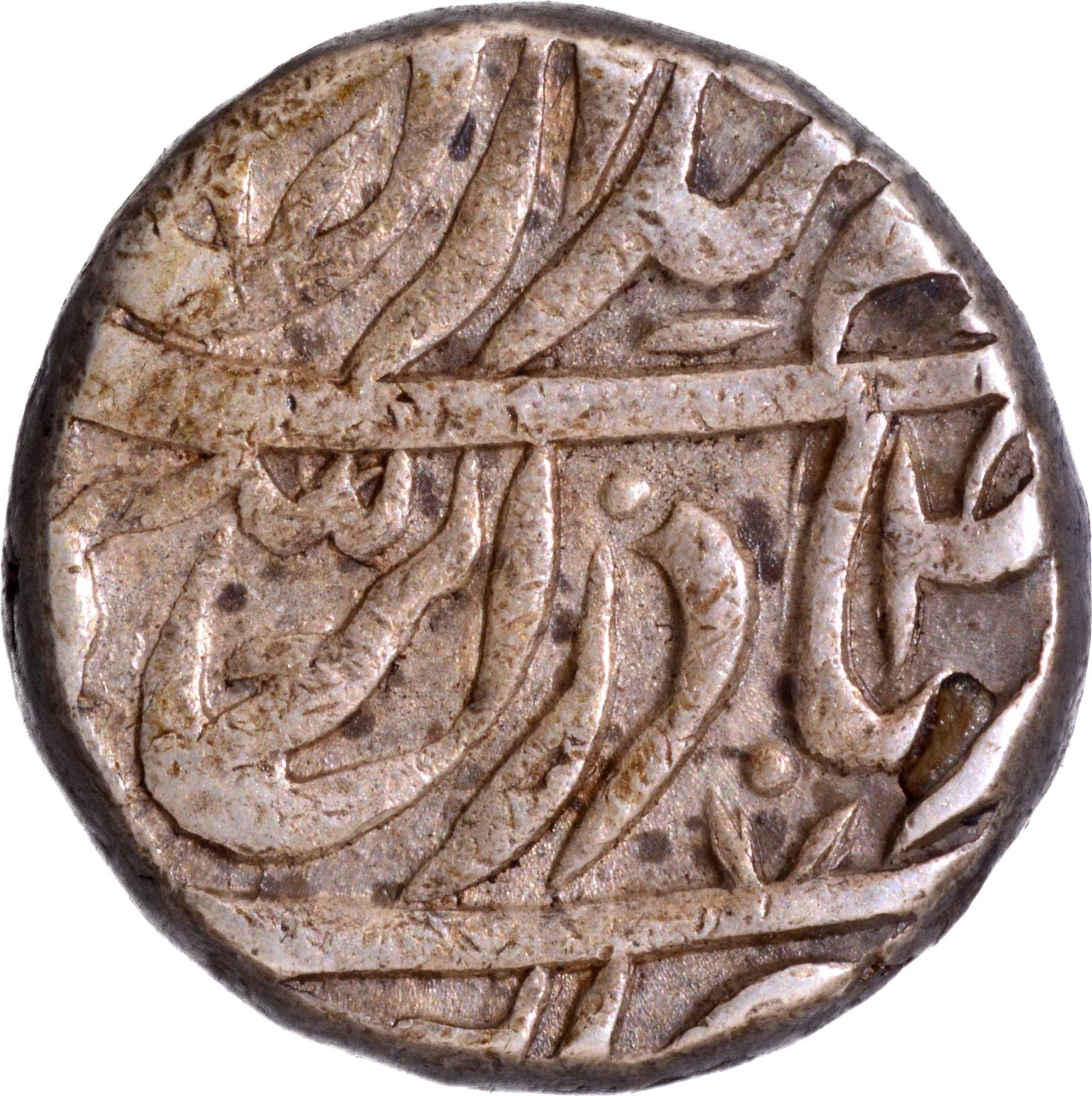 CIS-Patiala, Narinder Singh (VS 1902-1919 /1845-1862 AD), Patiala Mint (off flan), Silver Rupee, 'Qadir-e-Bechun' Couplet, VS (1903), In the name of Ahmad Shah Durrani, Obv: Persian legend "hukm shud az qadir-e-bechun ba Ahmad Badshah, sikka-e-zan bar seem-o-zar az auj mahi ta bamah”, Rev: a symbol of "swad" in Persian letter 'seen' of Julus, Khanda (Double edged straight sword) symbol at the left of ‘seen’ of ‘Julus’, Vikram Samvat year 1903 off flan above swad and floral mark, "zarb Sahrind" off flan at the bottom, 10.9g, 19.01mm, (Unlisted in KM / Saran & Dalwinder # PT18ea), about extremely fine, Very Scarce.