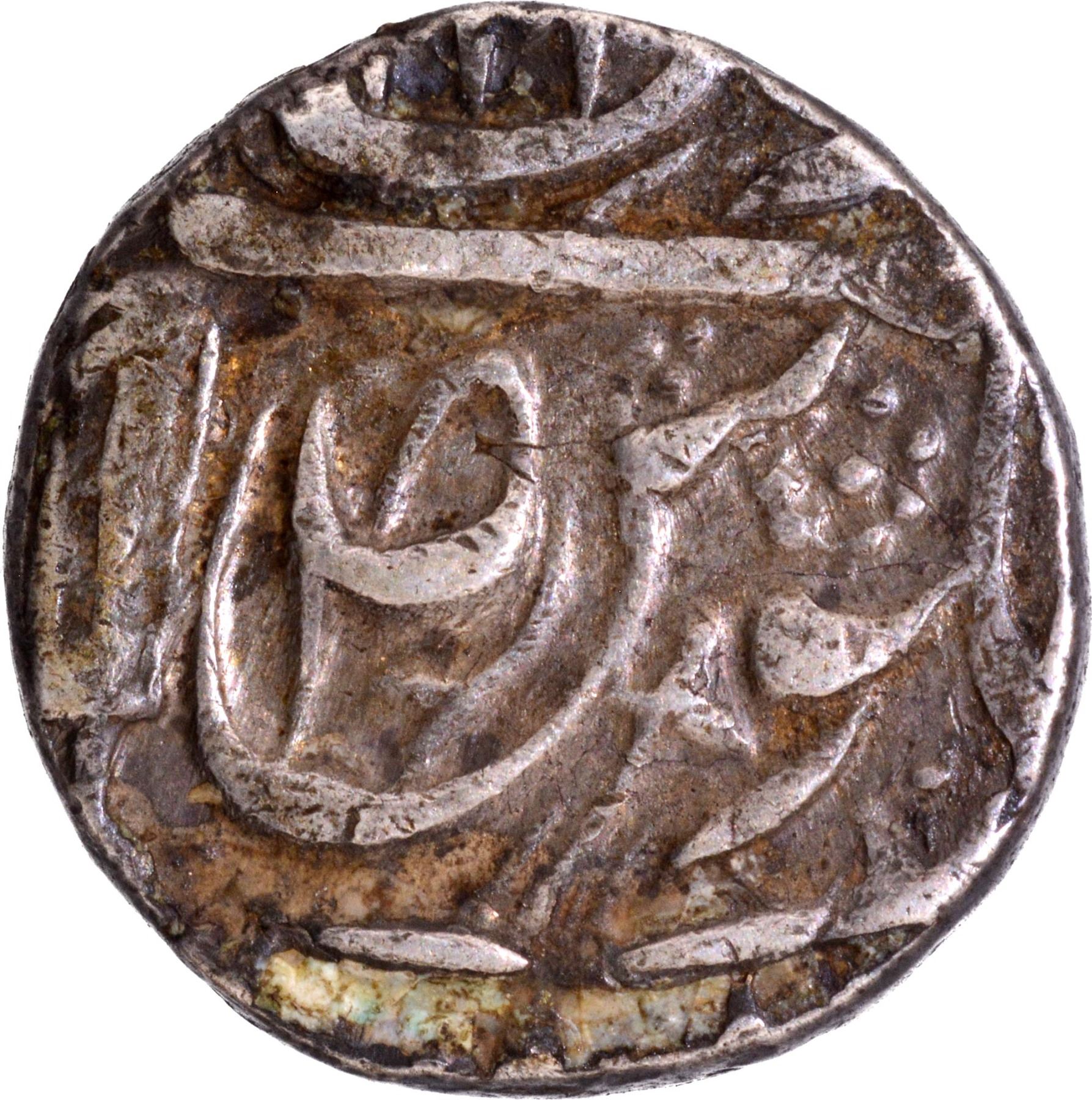 CIS-Patiala, Narinder Singh (VS 1902-1919 /1845-1862 AD), Patiala Mint (off flan), Silver Rupee, 'Qadir-e-Bechun' Couplet, VS (1903), In the name of Ahmad Shah Durrani, Obv: Persian legend "hukm shud az qadir-e-bechun ba Ahmad Badshah, sikka-e-zan bar seem-o-zar az auj mahi ta bamah”, Rev: a symbol of "swad" in Persian letter 'seen' of Julus, Khanda (Double edged straight sword) symbol at the left of ‘seen’ of ‘Julus’, Vikram Samvat year 1903 off flan above swad and floral mark, "zarb Sahrind" off flan at the bottom, 10.9g, 19.01mm, (Unlisted in KM / Saran & Dalwinder # PT18ea), about extremely fine, Very Scarce.