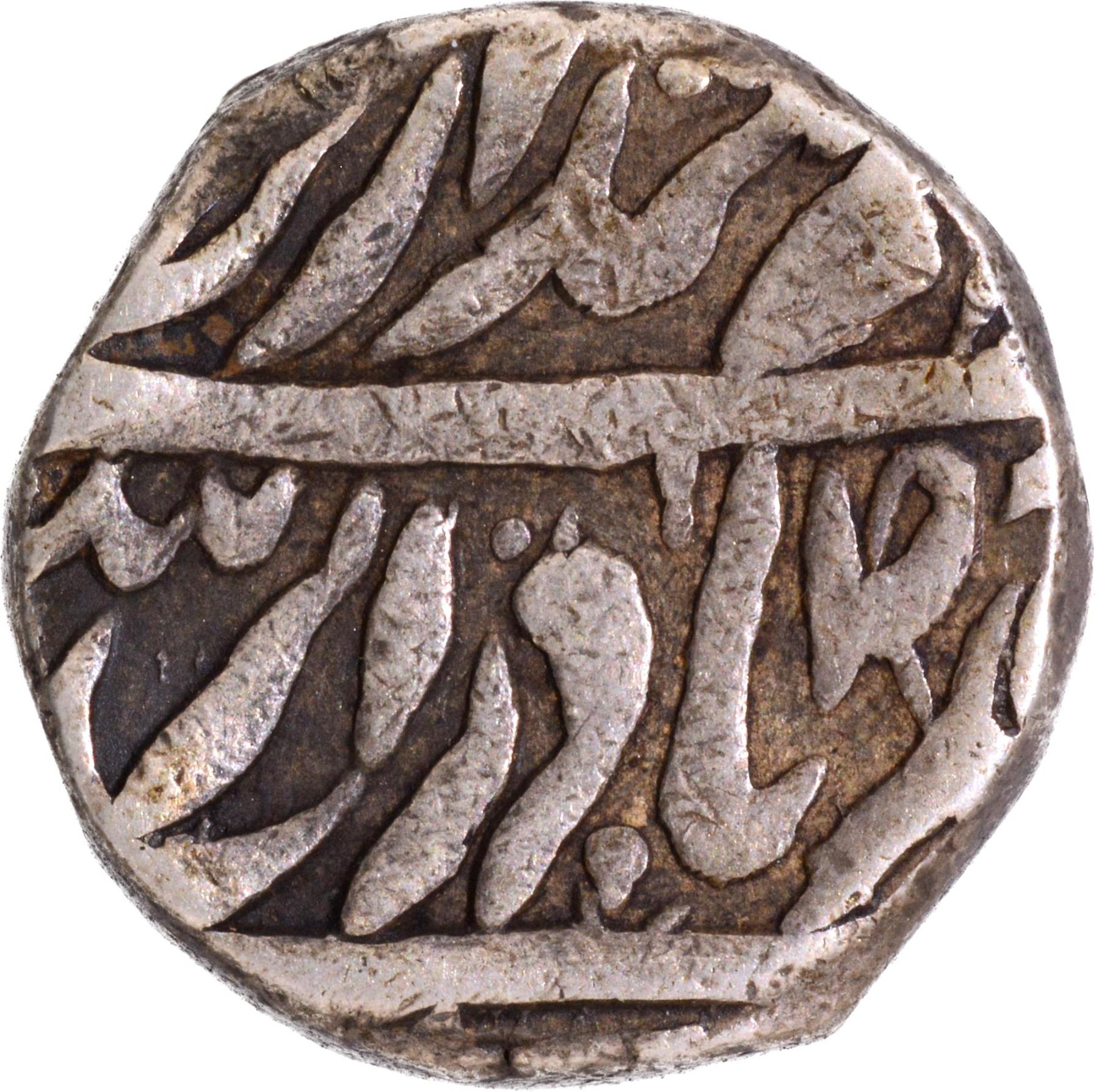CIS-Patiala, Narinder Singh (VS 1902-1919 /1845-1862 AD), Sahrind Mint (off flan), Silver Rupee, 'Qadir-e-Bechun' Couplet, Retrograde date VS 5091 for 1905, In the name of Ahmad Shah Durrani, Obv: Persian legend "hukm shud az qadir-e-bechun ba Ahmad Badshah, sikka-e-zan bar seem-o-zar az auj mahi ta bamah”, Rev: a symbol of "swad" in Persian letter 'seen' of Julus, Khanda symbol at the left of ‘seen’ of ‘Julus’, and Retrograde Vikram Samvat year 5091, "zarb Sahrind" off flan at the bottom, 11.0g, 17.38mm, (Unlisted in KM /Saran & Dalwinder # PT18h), about extremely fine, Very Scarce.