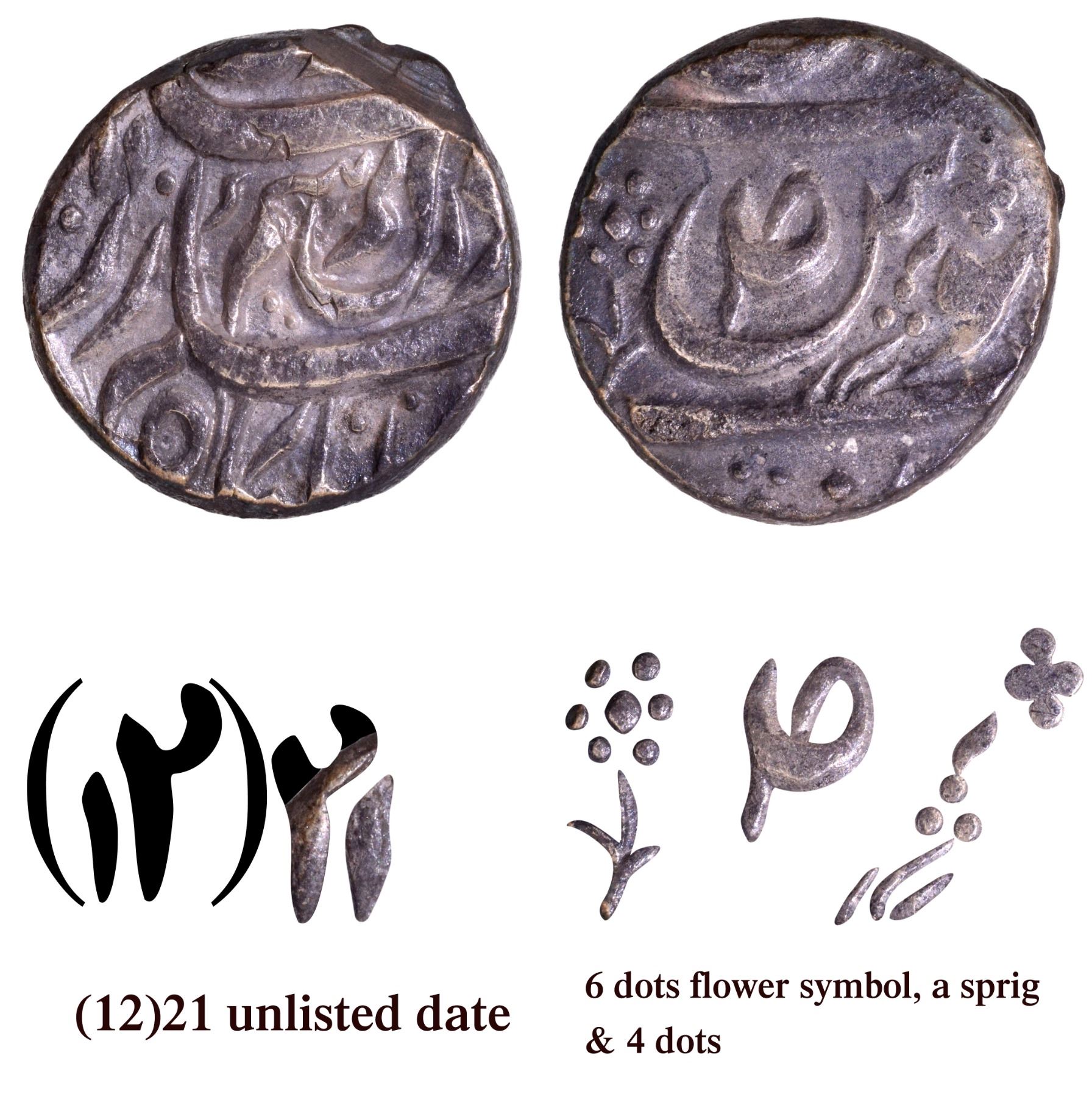CIS-Patiala, Sahib Singh (AH 1196-1229 /1781-1813 AD), Sahrind Mint (off flan), Silver Rupee, AH (12)21, 'Qadir-e-Bechun' Couplet, In the name of Ahmad Shah Durrani, Obv: Persian legend "hukm shud az qadir-e-bechun ba Ahmad Badshah, sikka-e-zan bar seem-o-zar az auj mahi ta bamah" with Hijri year (12)21, Rev: a symbol of "swad" in Persian letter 'seen' of julus and 6 dots flower symbol, a sprig, and 4 dots, "zarb Sahrind" off flan at the bottom,11.2g, 18.92mm, (Unlisted in KM /Unlisted Date in Saran & Dalwinder), a small gash on edge, about extremely fine, Very Rare.