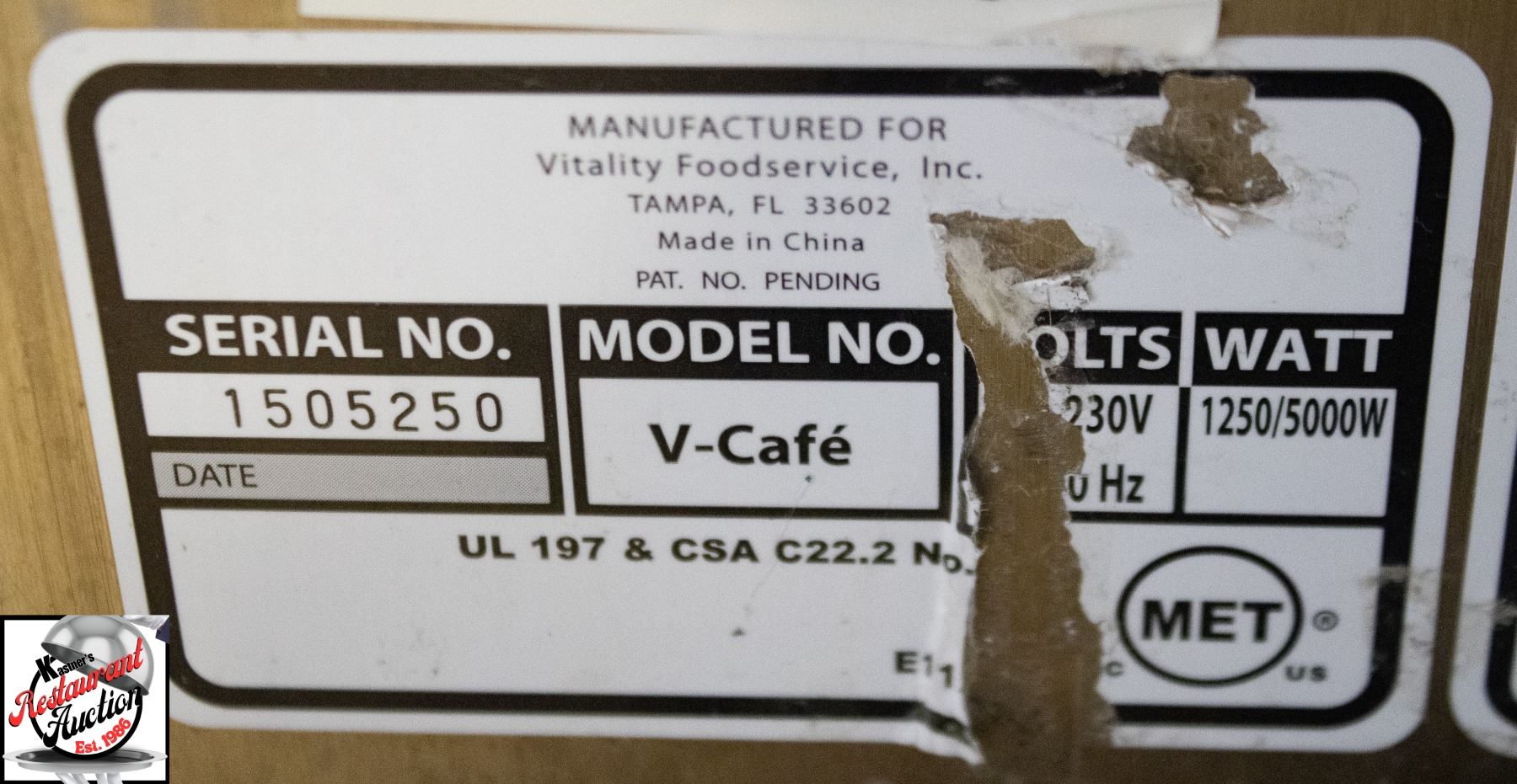 MODEL:V-CAFE, 110-230V, 50-60HZ, 1250-5000W, 13"X, 23"X, 30" ** INTERNAL INSERTS ARE MISSING AND WILL NEED TO BE REPLACED ALONG WITH A MISSING KEY FOR THE FRONT DOOR RESULTING WITH THE DOOR BEING STUCK OPEN **