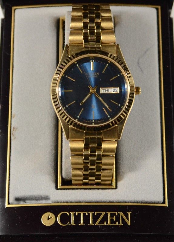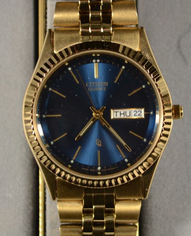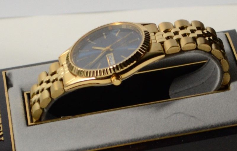 Stainless Steel band, water resistant, Japan movement, Face is sapphire blue. In original box. Est $100-$115
