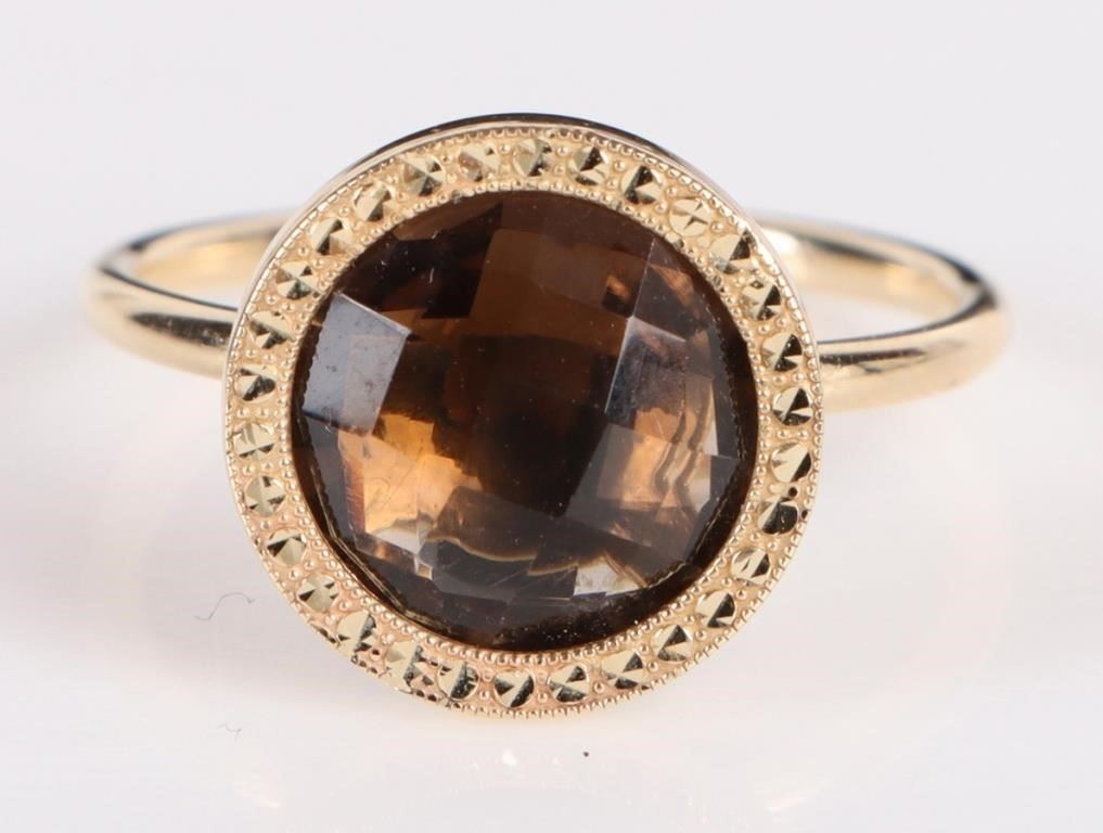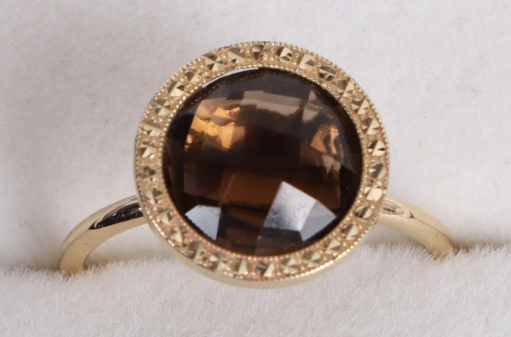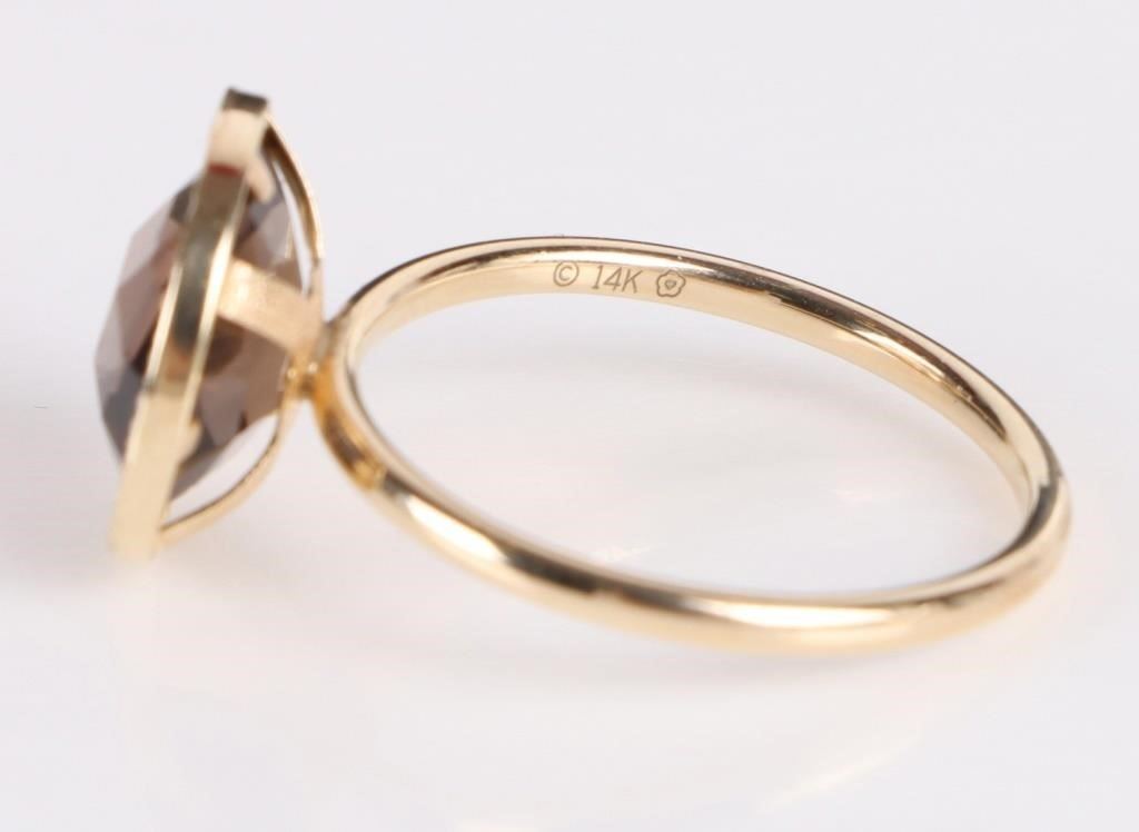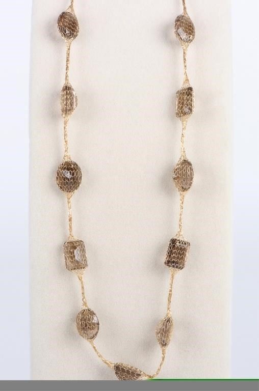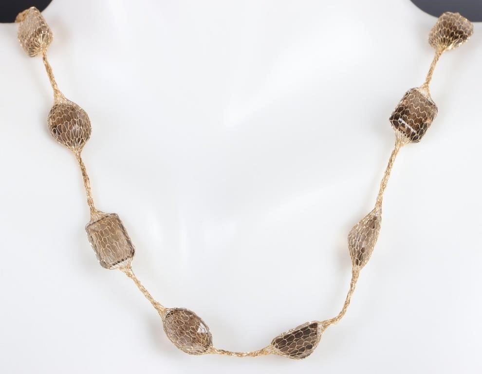 14K gold citrine or smokey quartz necklace and ring to feature: 14K necklace with mesh wrapped citrine or smokey quartz stones and 14K ring with round cut 2.5ct. citrine or smokey quartz.