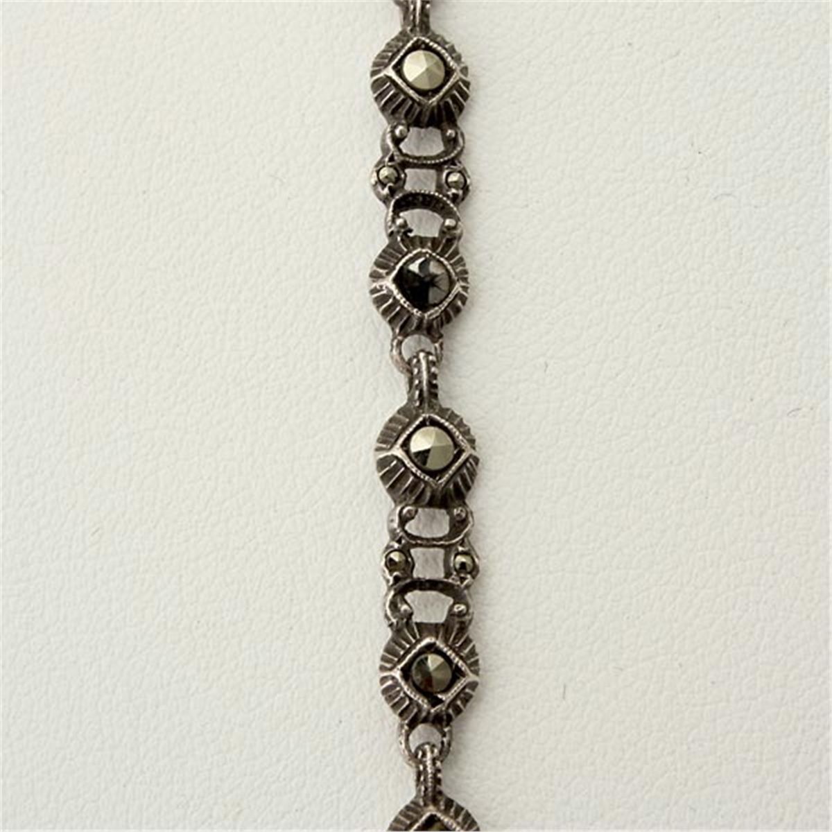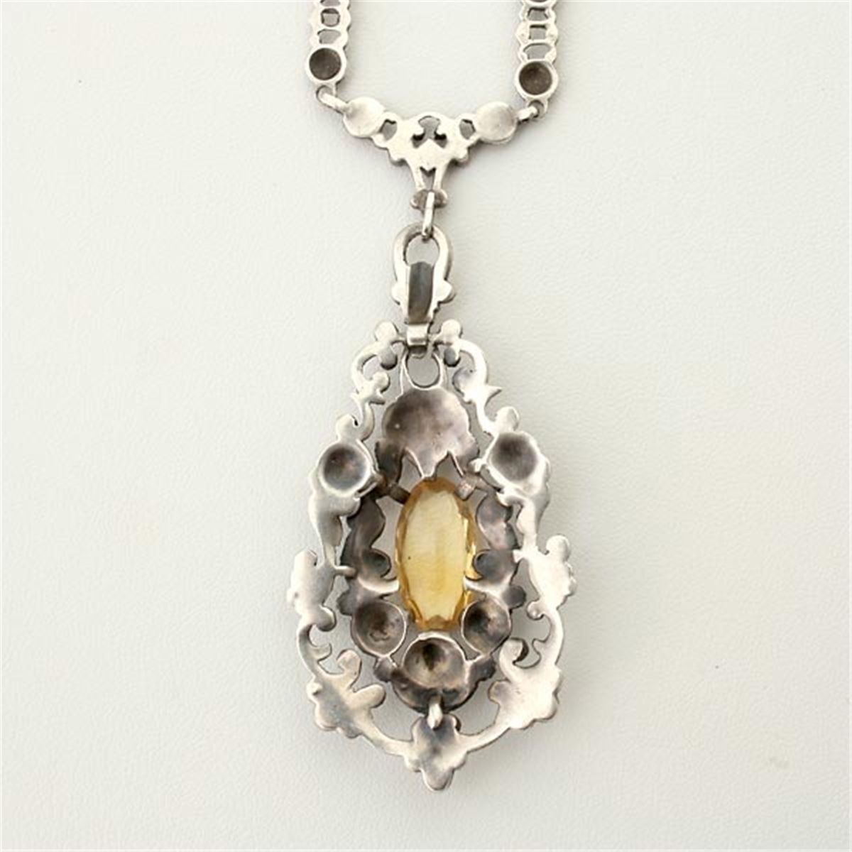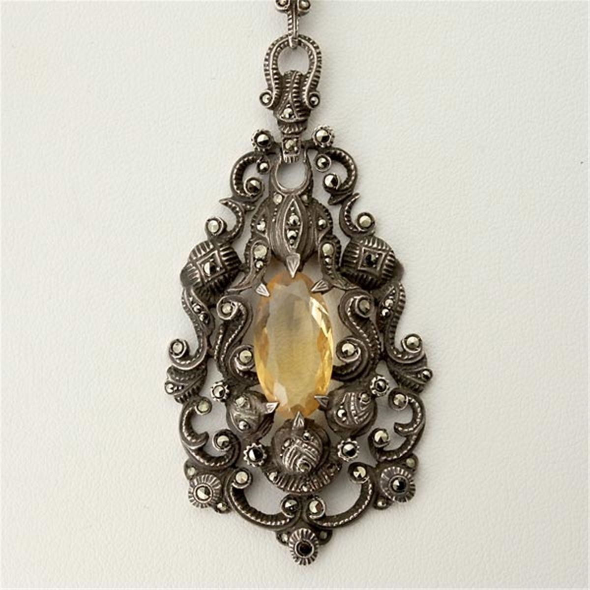 CITRINE, MARCASITE, STERLING SILVER NECKLACE. Featuring one oval-cut citrine weighing approximately 5.00 cts., accented by numerous faceted marcasites, set in a scroll motif, open work, sterling silver pendant suspended from a matching marcasite, sterling silver linked 18 inch chain. 20.2 dwts