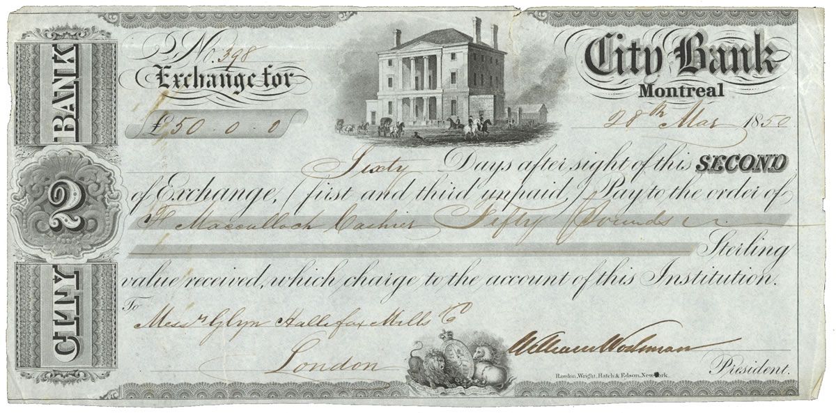 Montreal. A second of Exchange for £50.00. 28 Mar, 1850. Small 1/3" tear at top centre, otherwise EF.