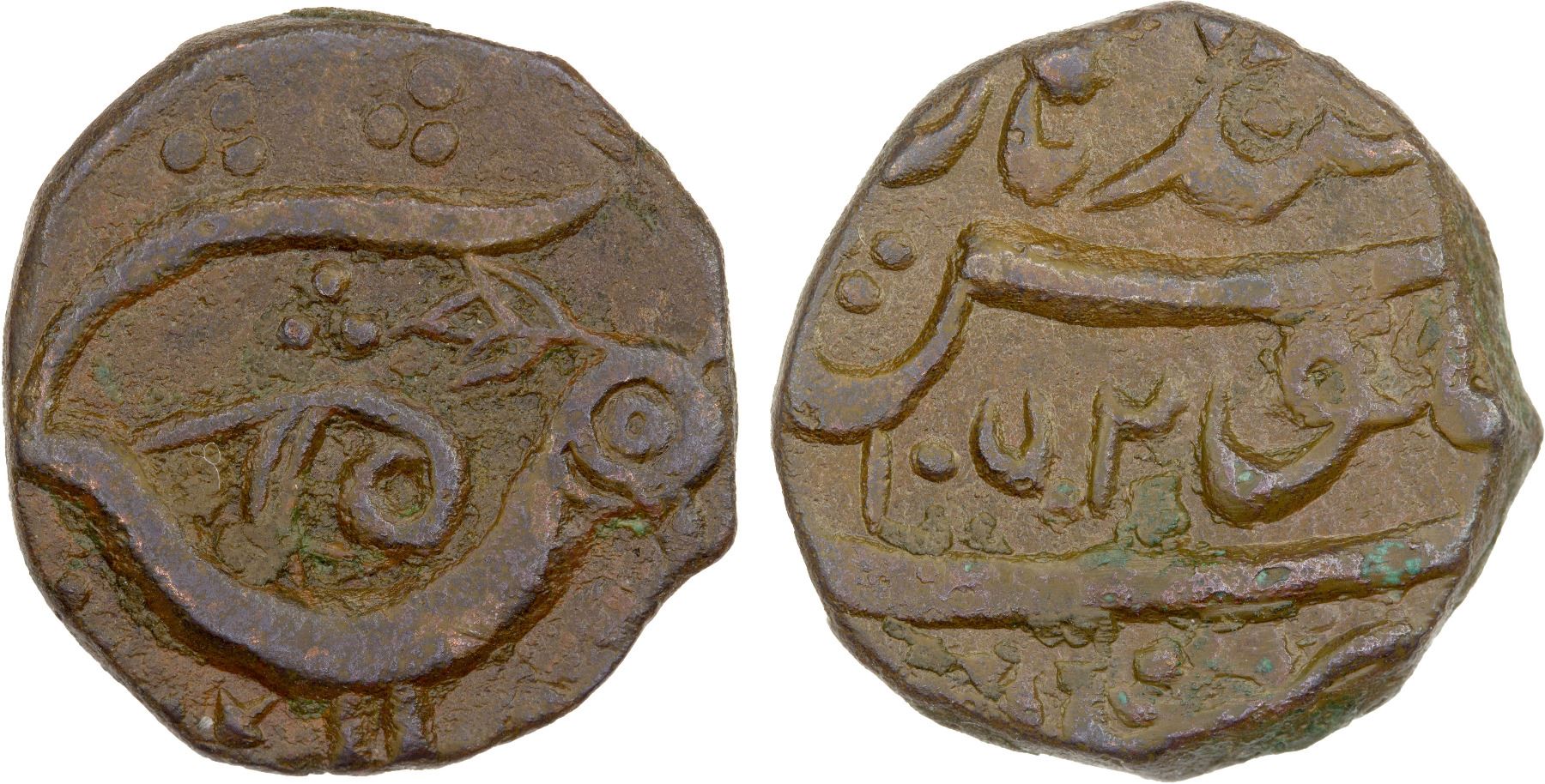 CIVIC COPPER: AE falus (4.73g), Qandahar, AH1072, A-3253, Persian peacock holding a long worm in its beak, hilarious example! bold strike with almost no wear, choice VF-XF, RR. An inferior specimen, possibly same obverse die, was sold in our Auction 47, lot 2093, and it shows the entire worm.