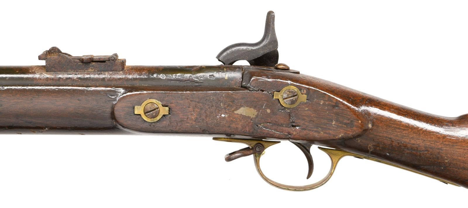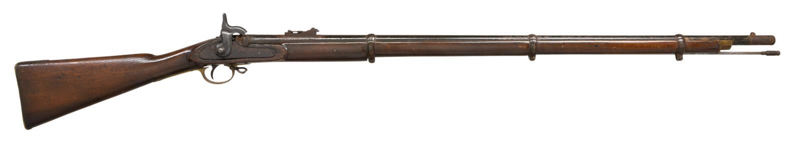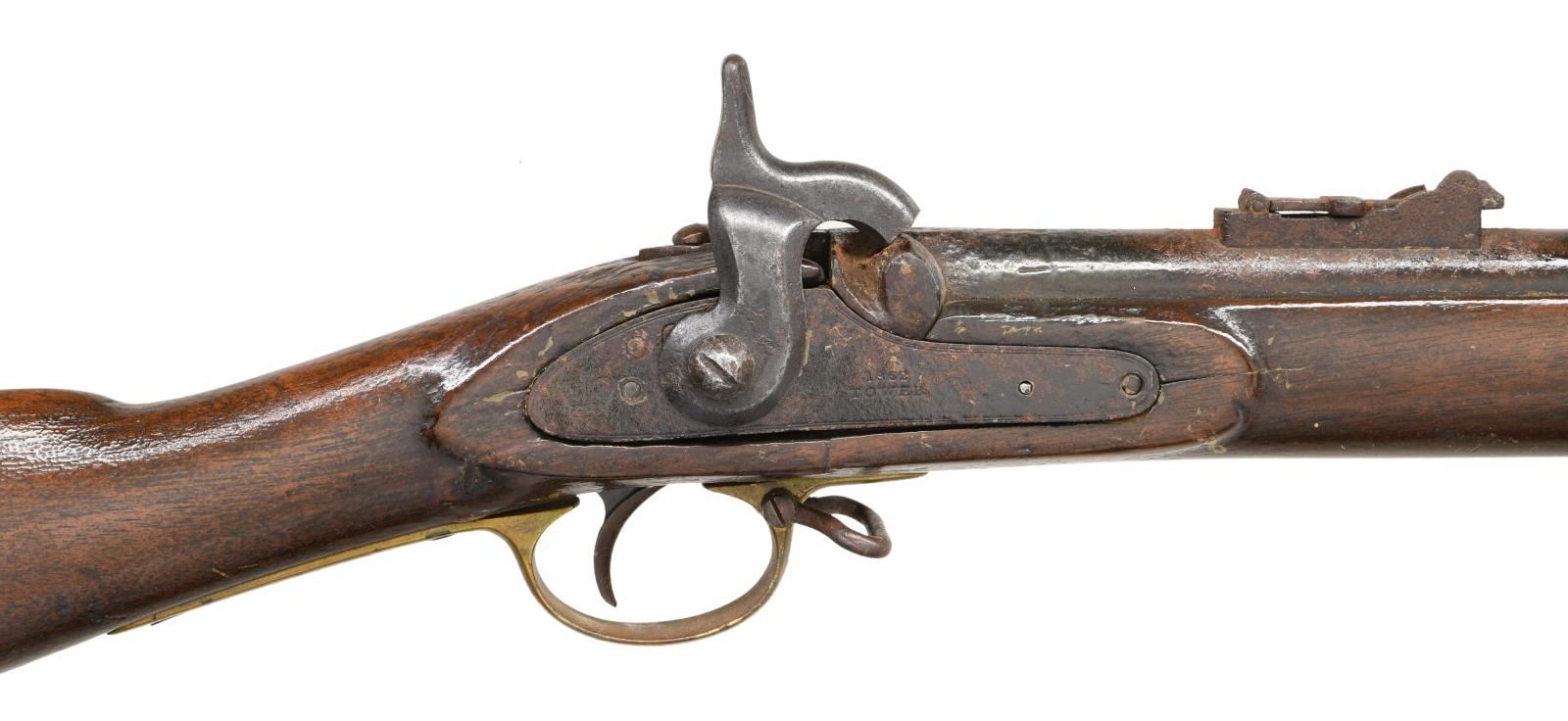 Cal. 577. NSN. Standard configuration of the most heavily used Confederate long arm in the Civil War, 39" barrel with Birmingham proofs, long range rear sight, brass trigger guard, nosecap, and butt plate. Lock Stamped "1862 / TOWER", & crown at tail. CONDITION: fair to good overall, appears complete and original other than replaced ramrod and sling swivels, missing nipple. Musket has been varnished over metal and wood. The hammer is replacement from Springfield musket, mechanics need attention, bore is reamed smooth, rusted and pitted. (01-22946/JS). ANTIQUE. $400-500.