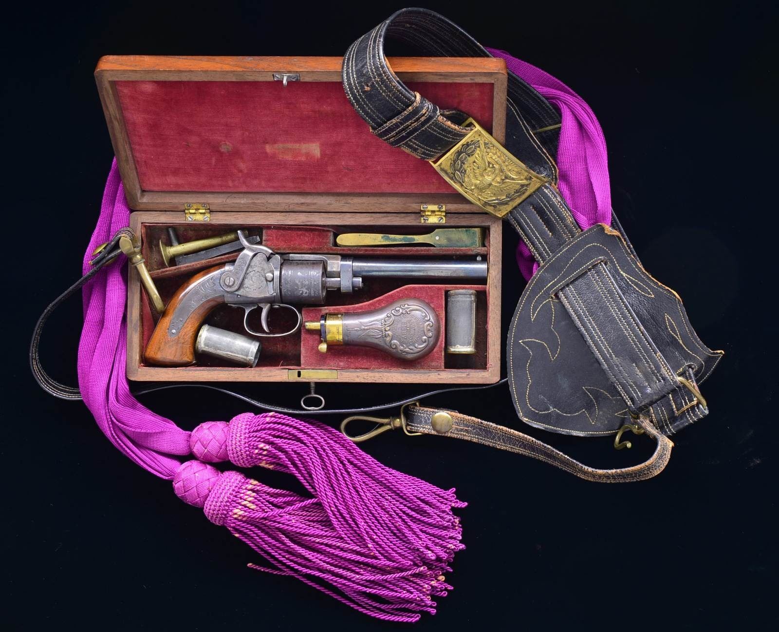 INCLUDING CASED WESSON & LEAVITT MASS ARMS PERCUSSION BELT REVOLVER & ABRAHAM LINCOLN SIGNED COMMISSION. 1) Cal. 31. S# 275. Bbl. 6". Only about 1,000 of these revolvers were made in the 1850s, & few were cased w/ accessories. Standard configuration w/ 6" round bbl., 6-shot cylinder w/ etched decoration; engraved frame, lock plate & hammer. Top strap: “MASS ARMS CO /CHICOPEE FALLS'' & capping door marked w/ large eagle surrounded by: MAYNARD’S PATENT SEP. 22. 1845”. Mahogany casing is red velvet lined & compartmented for the pistol, Mass Arms Co. marked brass mold & eagle flask, brass bullet starter/rammer, “L” shaped nipple wrench/screwdriver combination tool, 2 cap roll tins-one w/ embossed Maynard & Mass Arms patent information, 2 rolls of caps are in one tin. Case retains original functioning key. CONDITION: fine-excellent overall. Revolver retains 70-80% original thinning finish, grips are well fit retaining most of their original factory varnish. Mechanics need attention, will not hold cock and cylinder will not lock, bright shiny rifled bore.
