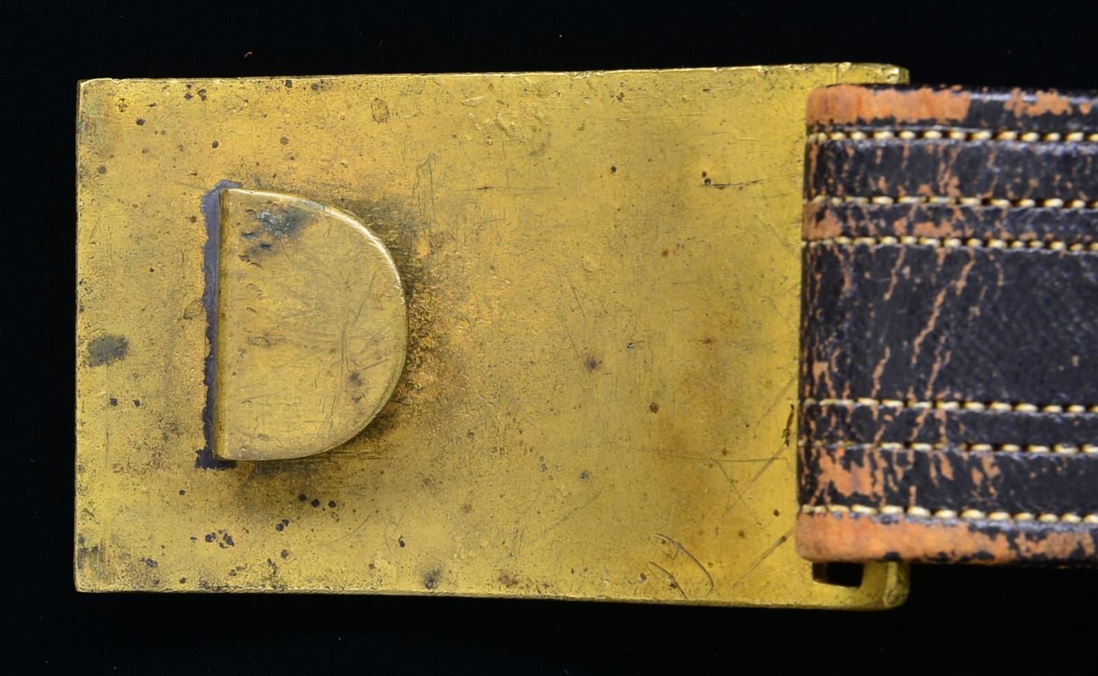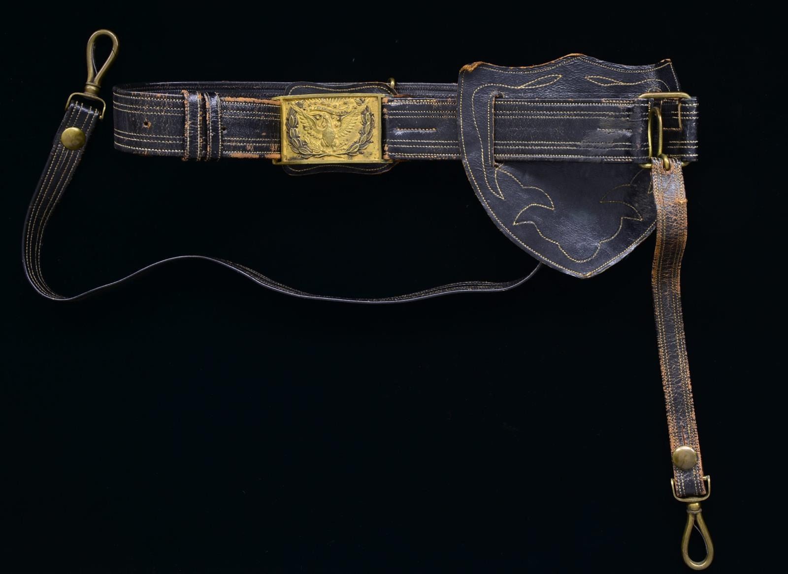 4) HIGHER GRADE OFFICER’S SWORD BELT, black patent leather w/ both sword hangers, protective leather shield, high grade gold washed eagle belt plate. CONDITION: very good & superior to most found, leather solid but dry.
