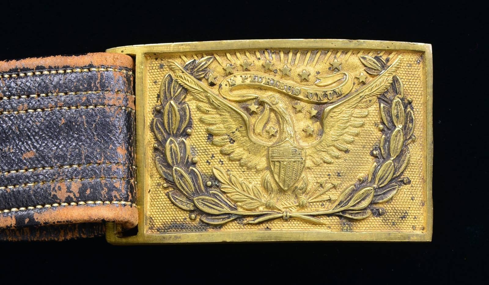 5) SILK OFFICER’S SASH. CONDITION: very good overall, red has faded to more of a purple, slight loss of red silk thread on tassels as can be seen in photos. Nathan G. King (1815-1903) through family descent of consignor. King’s obituary memorial states he helped raise 12th Michigan Infantry and 1st Michigan cavalry from his home in St. Joseph, Berrien County & served on McClellan’s staff prior to appointment of army paymaster in 1864. King was an attorney, banker & businessman much like his more well known younger brother Rufus H King. (01-19406/JS). ANTIQUE. $8,000-12,000.