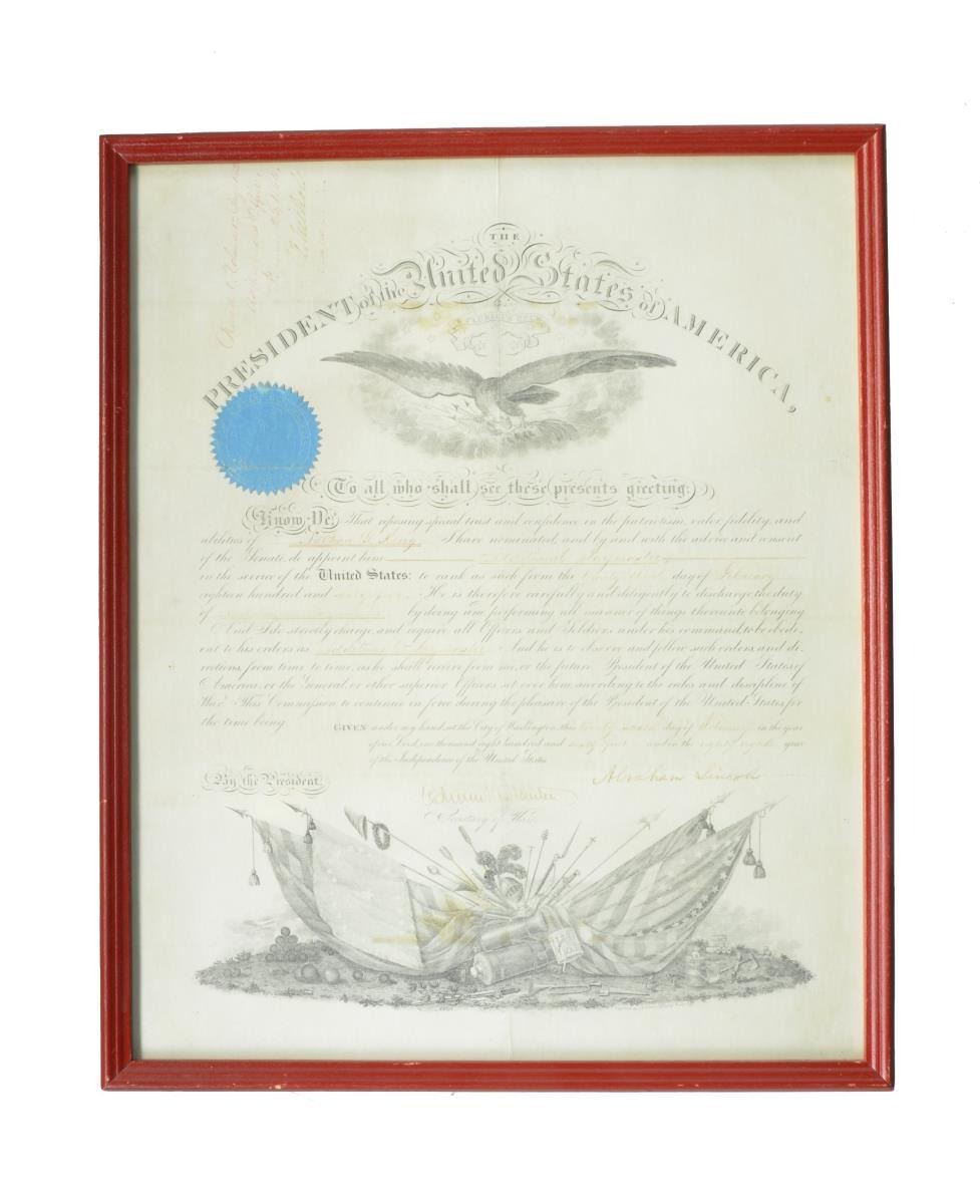 2) ABRAHAM LINCOLN SIGNED VELLUM APPOINTMENT FOR NATHAN G. KING as “Additional Paymaster”, February 23, 1864. CONDITION: vellum is very good overall though not removed from 19x16" frame. Ink has light fading as can be seen in photos but text is discernible. Lincoln's signature is very good.