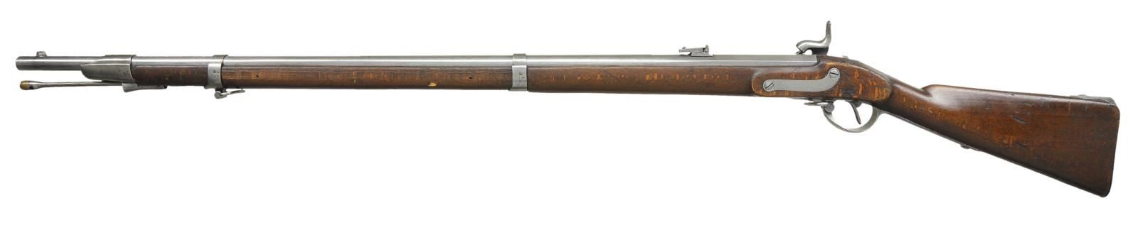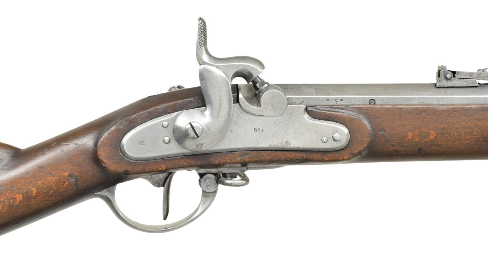 Cal. 58. NSN. Bbl. 37". Rifled bore. Top of bbl. marked "IH.SEDERL". Right side of lock marked w/ an Austrian eagle at rear & "861" beneath nipple. Both bands & nosecap are numbered "15". Adj. ladder rear sight graduated to 900 Schritt. Crude blade front sight. Beech stock. Tulip shaped ramrod. CONDITION: beech stock shows the expected scattered dings & handling wear. Metal surfaces were cleaned to bright w/ some scattered oxidation & a few spots of pitting. Pitted worn bore. (01-22247/MJC). ANTIQUE. $400-600.