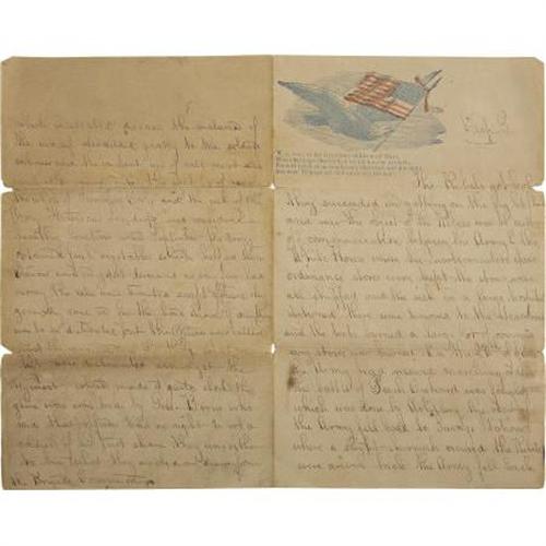 <B>CIVIL WAR AUTOGRAPH HISTORICAL MANUSCRIPT,</B></I> 15 pages, Octavo, on four separate leaves including three with a stunning <B>Extra-Illustrated Color Print</B></I> at the head, featuring an American Bald Eagle in flight carrying an American flag. Printed just beneath, <I>“Woe, woe to the traitorous children of Mars, Who challenge this bird, with his banner of stars; We will teach them this lesson, that truth and the right Are ever Triumphant, and must win the fight.”</B></I><BR><BR>The manuscript is accomplished in an unknown hand, but most likely written by a Union soldier who had a very informed, contemporary knowledge of the events he describes. The content is fantastic, written in a style which seems to have been intended to be published as an informal history. It stretches from the beginning of hostilities at Ft. Sumter through the battles of the Fall 1862 campaigns in Northern Virginia. The manuscript reads (in part): <I>“The United States at the present time is involved in a war to crush a Rebellion that could have been crushed in its infancy but the head of Government was weak in the hands of the northern population the President was an imbecile it appears that he had no power of his own...South Carolina that hotbed of treason seceded first then the Arsenal was seized...The time arrived when the first gun was fired Sumteer was surrendered and our flag was honored...This affair created the wildest excitement in the North men flew to arms with the determination to stand by the Union...On the 23rd of February 1862 the whole Army received orders to move. Banks division went and took possession of Harper’s Ferry while the bulk of the Army marched towards Manassas under the command of Gen. McClellan. It was here he issued his first address to the Army of the Potomac the roads beyond Manassas was impassable and McClellan decided that the Army should advance on Richmond by the Peninsula accordingly troops were at once embarked on steamboats and sent to Fortress Monroe the Army having all safely arrived...”</B></I><BR><BR>An excellent primary-source document covering the first two years of the Civil War. For a complete transcription of this manuscript please contact Heritage Auction Galleries.<BR><BR><B>Condition:</B></I> Some staining to leaves and separation at folds; on the whole, in good condition with bright, clear text.<BR><BR><b>Shipping:</b> Flat Material, Small (<a target="_blank" href="http://www.heritageauctions.com/common/shipping.php">view shipping information</a>)