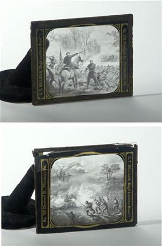 MILITARIA: Two black and white magic lantern slides depicting Civil War battle scenes, manufactured by C.T. Milligan, Magic Lantern Manufacturer, No. 728 Chestnut St., Philadelphia, Pa. Slides are not titled. Each measures 4'' x 3 1/2''. Damage to paper casing noted, as seen.