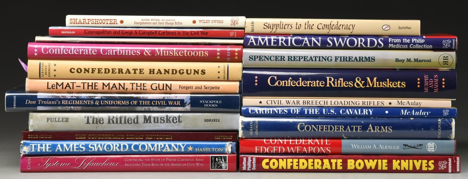 Lot of 20 books covering a variety of books relating to US Civil War arms & equipment. 1) CONFEDERATE HANDGUNS. Hardcover by William Albaugh III, Hugh Benet & Edward Simmons. 250 pgs. very good condition. 2) THE CONFEDERATE LEMAT REVOLVER. Hardcover by Doug Adams. No dust jacket present. 112 pgs. Good condition. 3) LEMAT THE MAN, THE GUN. Hardcover by Valmore Forgett & Alain Serpette. 219 pgs. Fair condition w/ notable dust jacket wear. 4) AMERICAN SWORDS FROM THE PHILIP MEDICUS COLLECTION. Hardcover by Norm Flayderman & Stuart Mowbray. 272 pgs. Good condition w/ moderate dust jacket wear. 5) CONFEDERATE BOWIE KNIVES. Hardover by Jack Melton, Josh Phillips & John Sexton. 286 pgs. Good condition w/ some moderate wear. 6) CONFEDERATE EDGED WEAPONS. Hardcover by William Albaugh. 198 pgs. Very good condition. 7) CONFEDERATE ARMS. Hardcover by William Albaugh & Edward Simmons. 278 pgs. Fair condition w/ laminated cover on dust jacket & notable wear. 8) SYSTEM LEFAUCHEUX. Hardcover by Chris Curtis. 312 pgs. Good condition. 9) THE AMES SWORD COMPANY 1829-1935. Hardcover by John Hamilton. 255 pgs. Fair condition w/ notable dust jacket wear. 10) CARBINES OF THE U.S. CAVALRY 1861-1905. Hardcover by John McAulay. 144 pgs. Very good condition. 11) CIVIL WAR BREECHLOADING RIFLES. Softcover by John McAulay. Good condition w/ some creasing & light staining. 12) SUPPLIERS TO THE CONFEDERACY BRITISH IMPORTED ARMS AND ACCOURTEMENTS. Hard cover by Craig Barry & David Burt. 192 pgs. Very good condition. 13) SHARPSHOOTER: HIRAM BERDAN HIS FAMOUS SHARPSHOOTERS AND THEIR SHARPS RIFLES. Hardcover by Willey Sword. Fair condition w/ some creasing & light staining. 14) COSMOPOLITAN AND GWYN & CAMPBELL CARBINES IN THE CIVIL WAR A DEFINTIIVE ILLUSTRATED HISTORY OF TWO RARE AND UNUSUAL CIVIL WAR CAVALRY CARBINES AND THEIR USE IN THE FIELD. Hardcover by Thomas Rentschler. 128 pgs. Good condition. 15) SPENCER REPEATING FIREARMS. Hardcover by Roy Marcot. 316 pgs. Very good condition. 16) DON TROIANI"S REGIMENTS & UNIFORMS OF THE CIVIL WAR. Hardcover by Earl Coates, Michael McAfee & Don Troiani. 267 pgs. Good condition w/ laminated cover for dust jacket. 17) THE RIFLED MUSKET. Hardcover by Claud Fuller. 302 pgs. Fair condition w/ wear to dust jacket. 18) AN INTRODUCTION CIVIL WAR SMALL ARMS. Softcover by Earl Coates & Dean Thomas. 96 pgs. Good condition. 19) CONFEDERATE RIFLES & MUSKETS INFANTRY SMALL ARMS MANUFACTURED IN THE SOUTHERN CONFEDERACY 1861-1865. Hardcover by John Murphy & Howard Madaus. Good condition w/ some stenciling on various pages. 20) CONFEDERATE CARBINES & MUSKETOONS. Hardcover by John Murphy & Howard Madaus. 320 pgs. Good condition. PROVENANCE: From the Collection of James B. Taylor. (02-19918-3/MJC). $500-800.