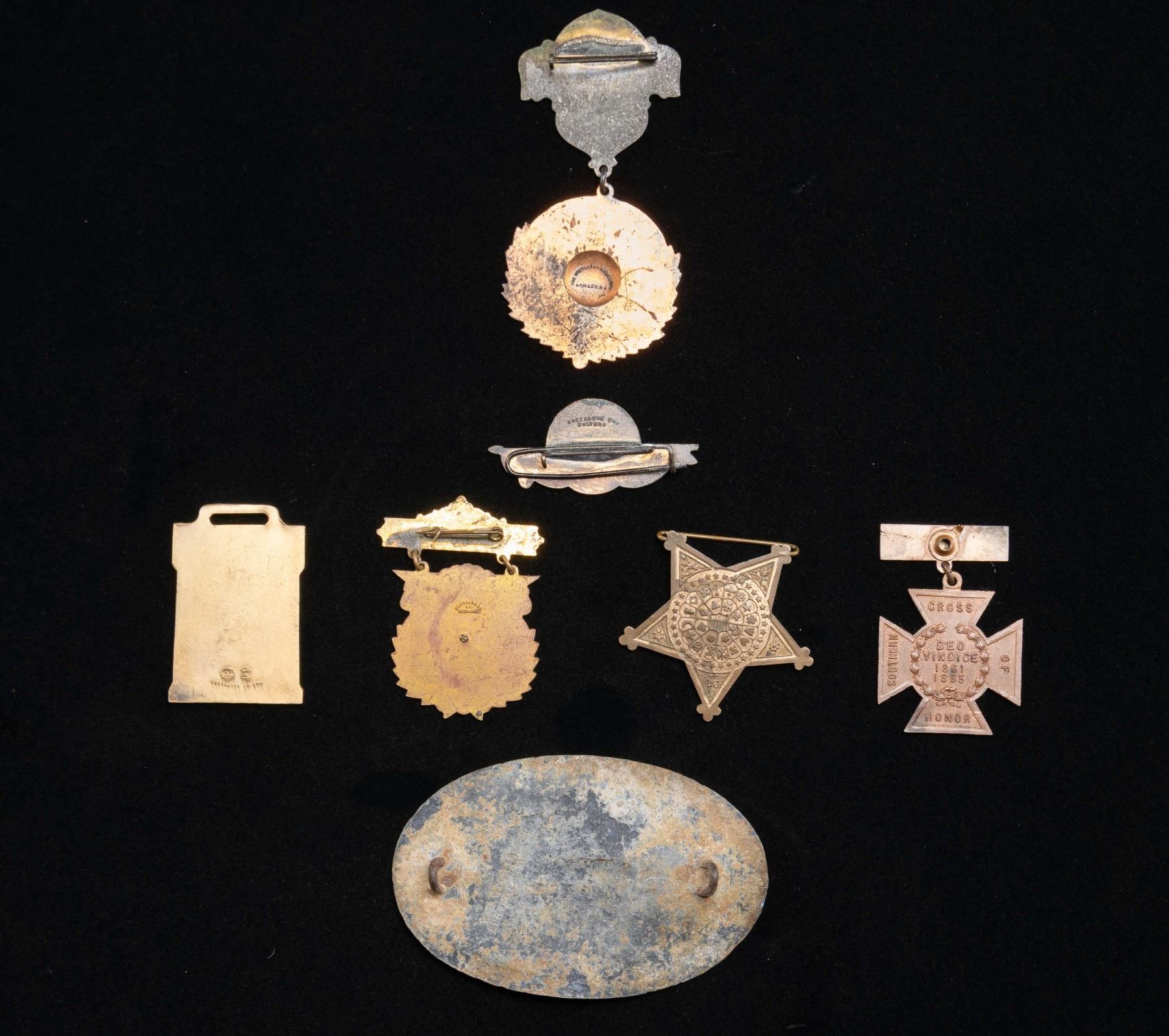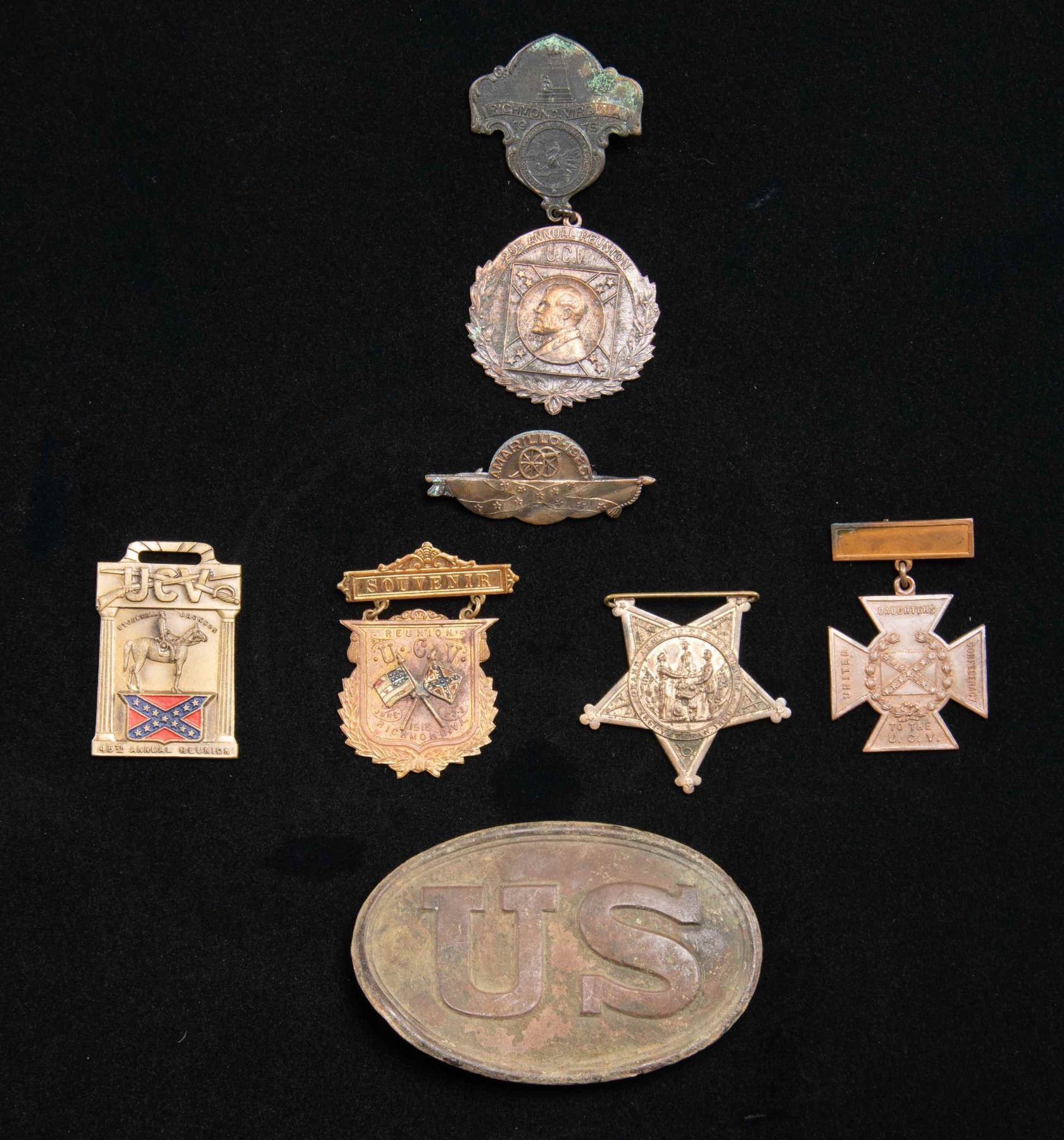 This very interesting lot includes 1 Excavated Union box plate with both loops intact. / 1 GAR membership medal without ribbon or bar. / 1 Southern Cross of Honor with bar. / 1 UCV reunion 1915 Richmond, Virginia badge with bar. / 1 UCV 45th annual reunion watch fob. / 1 UCV Amarillo 1935 suspension bar only with a broken pin. / 1 UCV 25th annual reunion Richmond, VA showing a Lee profile. (02-24267-4/BF). NON-GUN. $350-500.