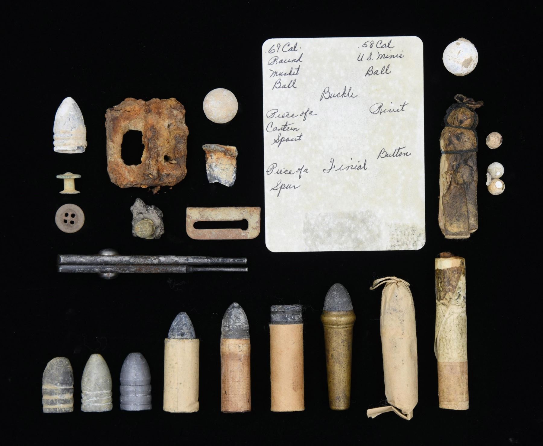 This fascinating lot includes 1 paper-wrapped 58 cal. musket cartridge. / 1 Smith carbine, paper-wrapped 50 cal. cartridge. / 1 Sharps carbine 52 cal. linen cartridge. / 1 Burnside cartridge. / 1 Reproduction .577 Enfield cartridge. / 1 Original .577 Enfield cartridge. / 3 Dropped 58 cal. and .577 cal. bullets. / 1 Paper-wrapped buck & ball cartridge. / 1 Dropped buck & ball set. / 1 Framed group of excavated Civil War small artifacts. CONDITION: paper and linen cartridges show light to moderate wear. Excavated items have typical patinas. (02-22943/BF). $300-450.