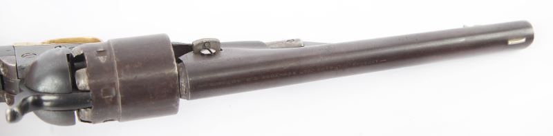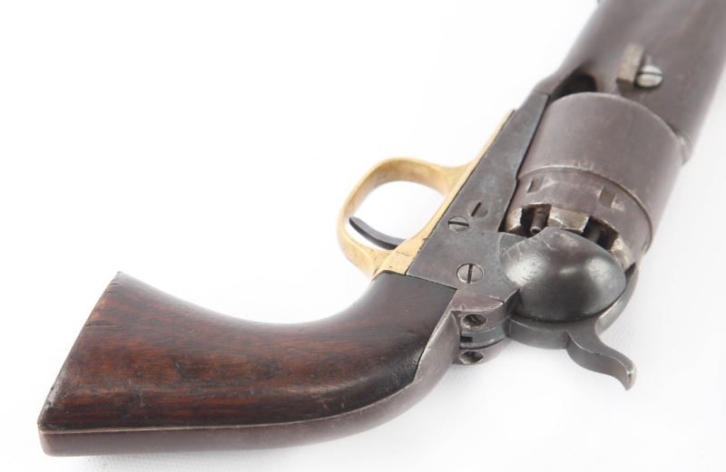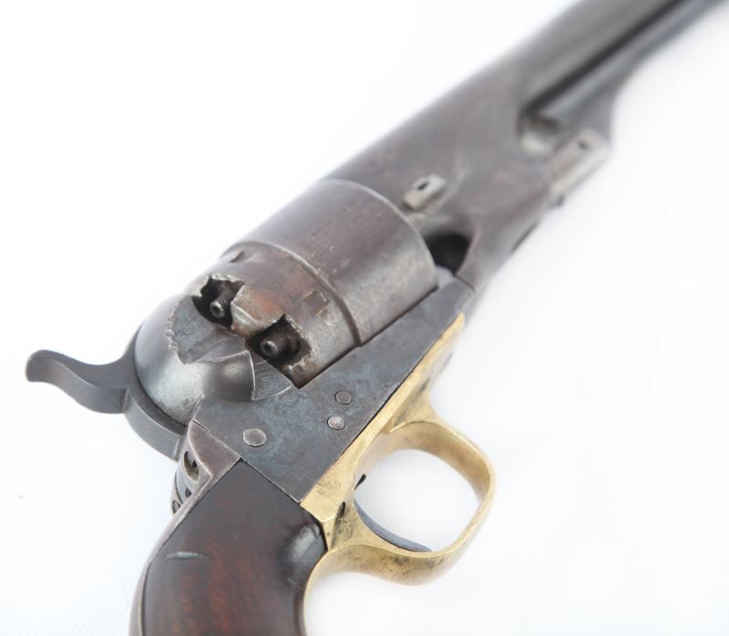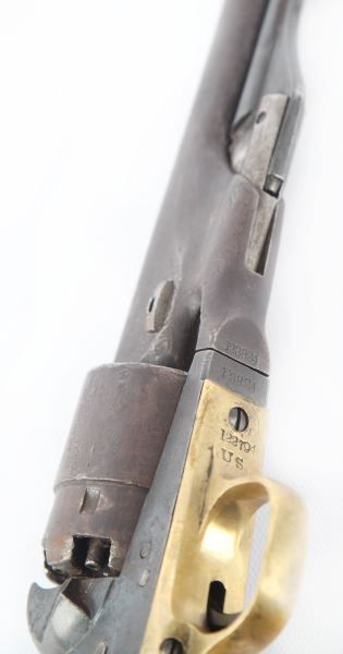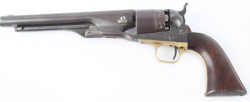 Colt Model 1860 Army percussion revolver, manufactured in 1863. Serial number on trigger guard assembly non-matching. "US" marked on front of trigger guard, with "H" stamped in back of trigger, as well as top of back strap just under hammer. Dark plumb patina to metal surfaces. Grips are good, with moderate wear. Moderate play in cylinder, but hammer and spring still strong. Overall good condition. Caliber: .44 Serial #: 123824 This lot has a reserve.