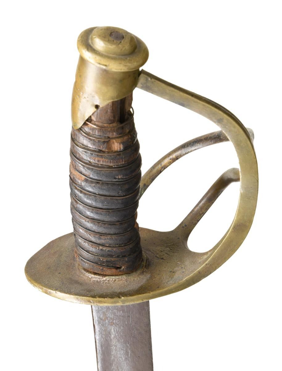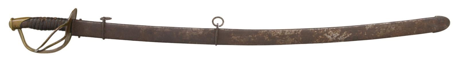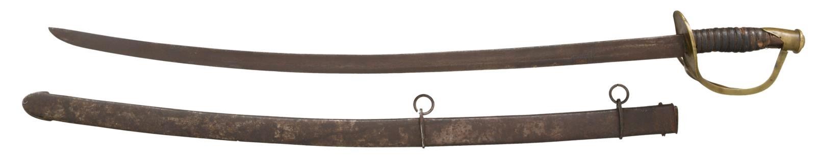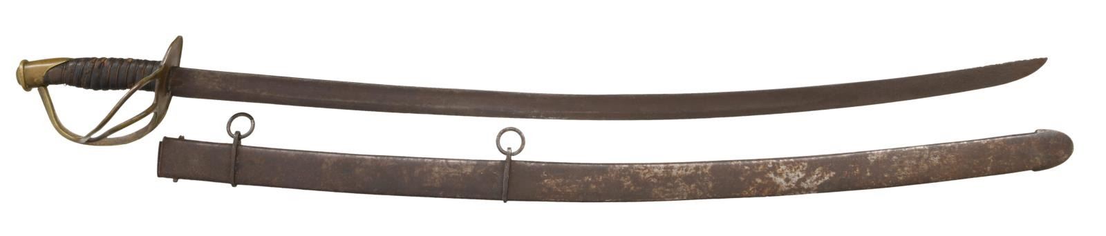 34.5" blade with unstopped fuller, model 1860 style hilt & grip, European iron mounted scabbard. CONDITION: good overall, blade is brown, pitted with grinding marks, original leather grip is about 60% intact, thin single wire wrap is complete, appears re-peened. Scabbard fits blade but made for wider blade. (02-19157/JS). $400-500.