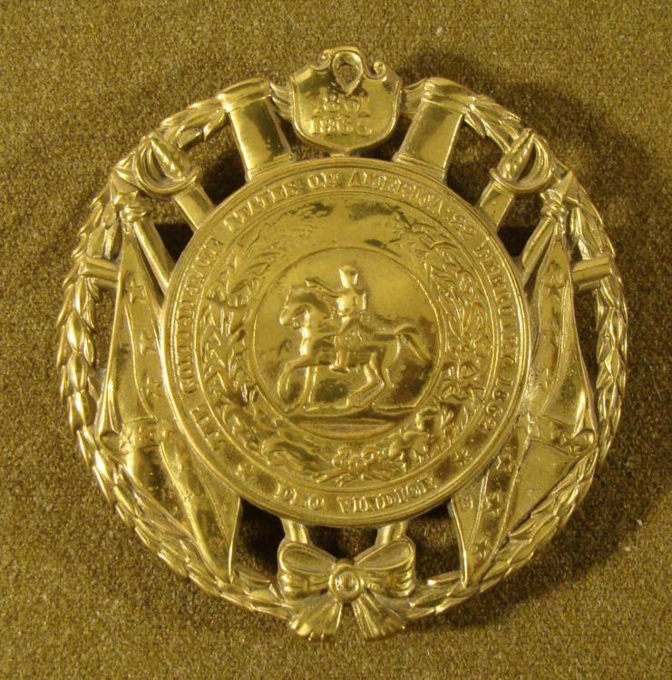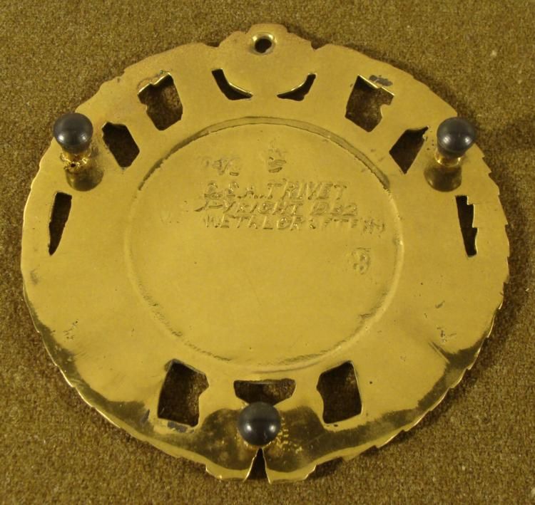 CIVIL WAR CONFEDERATE CIRCULAR BRASS TRIVET/WALL PLAQUE-5" INDIAMETER-BRASS-SHOWS SWORDS &CANONS AND TWO CONFEDERATE FLAGS WITHA SHIELD WITH THE YEARS 1861-1865 ON THE BORDER EDGE--CENTER HAS A"CAVALRY SOLDIER, AROUND WHICH READS ""CONFEDERATE STATES OF AMERICA-22""FEBRUARY 1862"" AND ""DEO VINDICE""--REVERSE ""10-18 CSA TRIVET-COPYRIGHT""1952--VA METALCRAFTERS"""