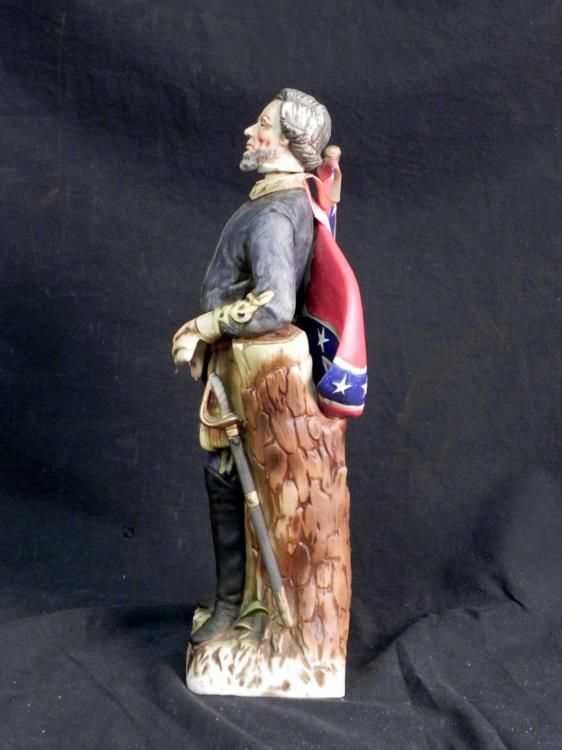 CIVIL WAR CONFEDERATE GENERAL JEB STUART PORCELAIN DECANTER-VINTAGE-12" TALL---OUTSTANDING COLORFUL VINTAGE PORCELAIN DECANTER OF J.E.B. (JEB) STUART. 12 INCHES TALL-JEB WAS FROM VIRGINIA AND BECAME A CONFEDERATE STATES ARMY GENERAL IN THE CIVIL WAR-KILLED IN 1864 IN THE BATTLE OF YELLOW TAVERN.- STATUE HAS JEB STANDING IN FULL CONFEDERATE UNIFORM AND SWORD--BEHIND IS A CONFEDERATE SWORD--BOTTOM MARKED "AMERICANA PORCELAIN-McCORMICK DISTRIBUTING COMPANY" BOTTOM MARKS ARE IN REVERSE BY ERROR--JEB'S HEAD IS LOOSE BECAUSE OF DEGENERATING CORK ON STOPPER--GREAT CW PIECE