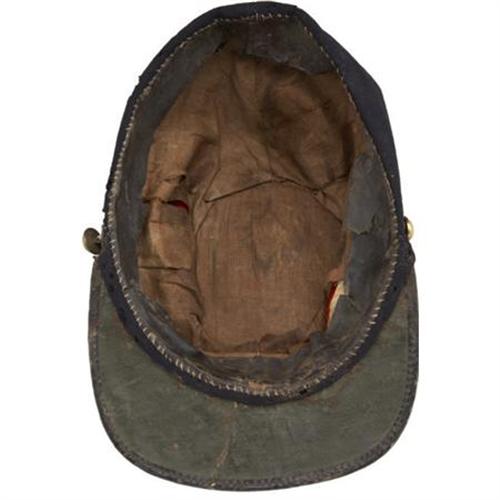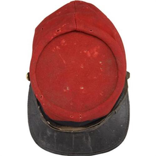 <B>CIVIL WAR PERIOD CONFEDERATE MANUFACTURED ARTILLERY KEPI.</B></I> This regulation style kepi features the red crown with a dark blue band around the bottom. The material is probably hop-sack or broad weave wool. The intact lining is likely polished cotton. The chin strap is tarred linen and the brim, tarred pasteboard. The chin strap eagle buttons are U. S. pre-war.<BR><BR><B>Condition</B></I>: Overall condition is good with minor moth damage on the outside fabric. Colors are bright.<BR><BR><B>Provenance</B></I>: In an old North Carolina collection until acquired by the current owner in 2004. A private Tennessee collection.<BR><BR><b>Shipping:</b> Clothing, Costumes & Jerseys (<a target="_blank" href="http://www.heritageauctions.com/common/shipping.php">view shipping information</a>)