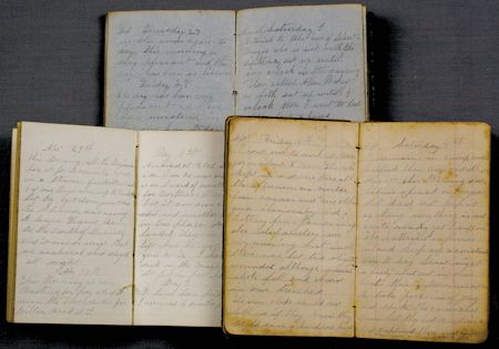 Fine grouping of three war-date diaries of Sgt. Cyrenius R. Stickles of the 1st N.Y. Engineers, one daily entry in clear, legible pencil per page, covering various periods of time the period from the day of his enlistment, Nov. 16, 1861 until a week after he is mustered out, Dec. 24, 1864. Stickles and the 1st N.Y. saw action along the coast of the Carolinas, at the siege of Fort Wagner, at Bermuda Hundred, and also during the siege of Petersburg. In small part: "...Sworn into the U.S. service, then went to Barnum museum...attend the burial of one of our company...we buried him in the deep, deep sea...at Bermuda Hundred, as also during the siege of Petersburg...He loved the bottle most, too well for his own good...so he killed himself...had a general inspection by Brigadier General Sherman...a battle has been going on near Beaufort...the 8th N.Y. Regt. drove the rebels and burnt the place...I have just seen a balloon ascension by Prof [Thaddeus] Lowe the first one I ever saw...Capt. gun shot himself today with a pistol, he put the muzzle to his mouth and the ball went up through the top of his head...I can hear heavy cannonading in the direction of Fort Pulaski...we had a nice time a playing ball...we heard tremendous firing at Fort Pulaski...the report is that the fort has surrendered...about 100 prisoners came here...we left St. Augustine for Hilton Head...the General wanted to know whether we would do our duty or not and we all finally concluded it was best to do our duty...our guns has been given back to us...There was 5 or 6 Co. A that still refuse to do duty and they have sent them to the provost guard...we had 4 prisoners to carry knapsacks with 20 lbs in it 6 hours a day...had one drunken man from another regt. In a while, he was also relieved and one to carry a barrel with a hole through the bottom, it came down around the body...we landed on Folly Island...the ironclads and Fort [?] had an engagement of about 2 h. long when the ironclads went back to sea again and three run past the fort...there was a man shot by the sergt. Today...he was out of camp drunk and the sergt. was after him, the man used some vulgar language and the sergt. shot him dead...the bombardment of Morris Island began this morning......we have possession of 3 batteries on it...at daylight the rebs opened fire on our gunboats also attacked our pickets...about 10 killed and 25 wounded...our folks made a charge on Fort Wagner but met with a repulse with a loss of about 500 in killed and wounded...rebs came down with a flag of truce and a lot of our sick and wounded soldiers so the firing stopped all day...Sumter is getting battered up pretty well...we were fired at by sharpshooters at Fort Wagner & a flag of truce was sent to the front but no use...very sharp fire from Wagner and Johnson but did no serious injury except to knock down some of our works...one man was killed about 5 feet from me by a solid shot, he had about one half his head blown off. The Lieut. Col. of the 8th Pa. Regt. was killed by a shell from one of our own guns, it blew his brains out...the monitors went up towards Fort Moultrie and he and other batteries opened on them, and there was brisk fire...severe fire all the afternoon, one mortar from Wagner...and a battery from James Island, also sharpshooters...the monitors would not help us, if they knew they would save a hundred lives...party went out in some boats, their intentions were to take possession of Greg and spike the guns and leave but they met 15 rebs in a boat [and] captured them...kept up a constant fire on Wagner...one of Co. B men had his head blown off by a torpedo...we are in possession of Forts Wagner & Greg...scouts and ironside commenced on Fort Moultrie and the batteries on Sullivans Island...had a magazine destroyed and a number of fires...they say Fort Sumter has been on fire for two or three days...anchored at Hilton Head...some of the hands on board got drunk and we had them bucked and gagged...one of our boys got stabbed by an Italian...encountered a heavy force at Olustee...began to retreat with a loss of about 2,000 men...the steamer Maple Leaf was blown up by a torpedo...our first job is to stockade Battery Burnside...there was a man shot for desertion...everyone was ordered out to see the execution. It was a solemn scene and it is hard to think of, but I say let them be loyal. He stood it like a brave soldier...we went over to the soldiers burying ground...we saw two buried while we were there from the U.S.C.T...rebs have opened a battery from just below Secessionville and are shelling Middle Island...this evening there is a large fire in Charleston...went over to the Swamp Angel and hung a door to a magazine...I have been up to Gregg viewing this forenoon, there was a flag of truce boat come out from the City...". The diaries continue with descriptions of continuing bombardments of the forts surrounding Charleston, and conclude with his return home. Very good condition. Sold with Stickles' post war collar and cuff box, red fabric-covered with two compartments, each topped with a leather cover embossed with an eagle motif, ca. 1870. A rare set of engineer's diaries from the siege of Charleston.