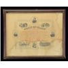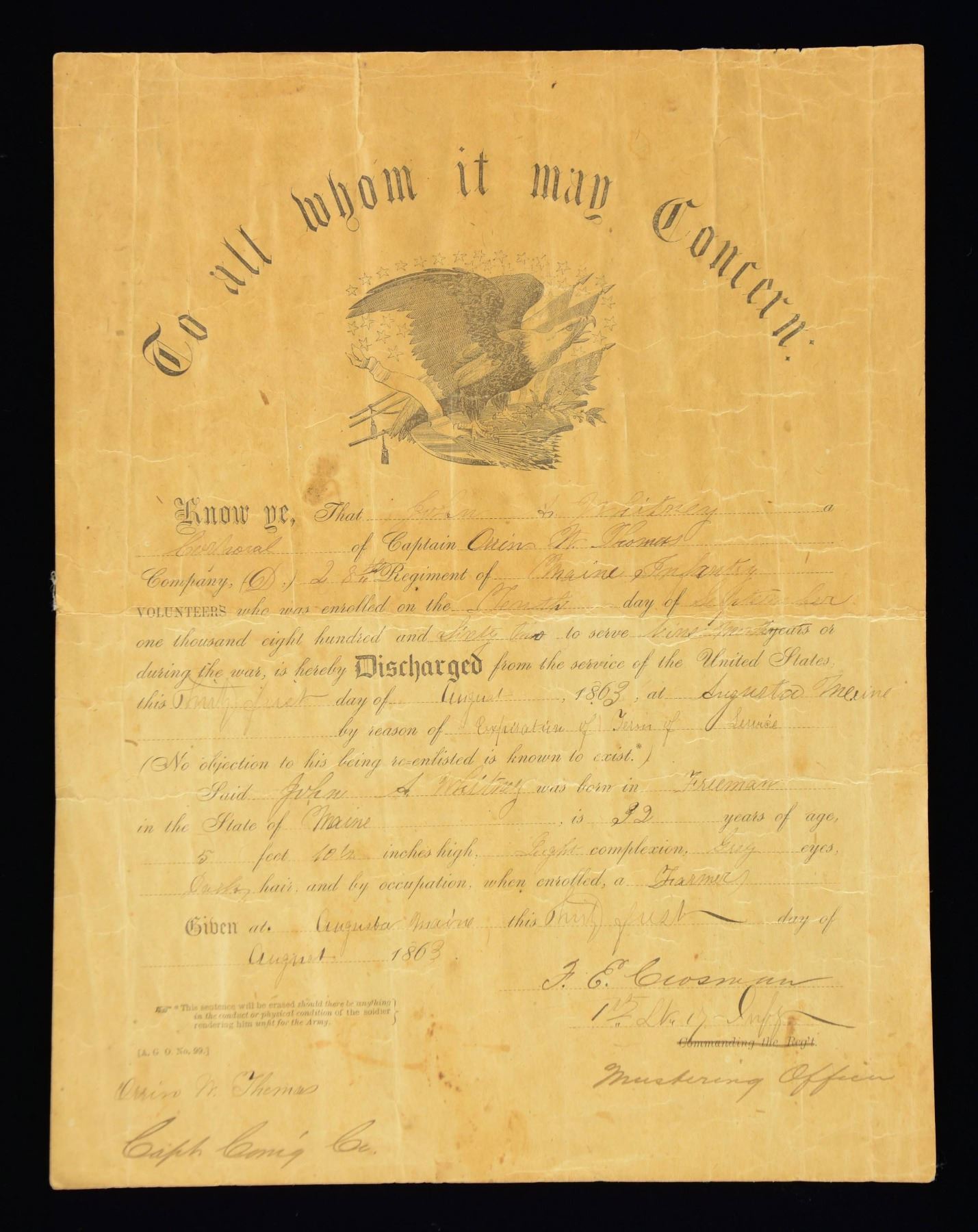 28th MAINE INFANTRY. Discharge dated August 31, 1863 for corporal Whitney, Co. D, 28th Maine after 2 years service. 18"x14" framed Maine Civil War service memorial with facsimile signature of Joshua Chamberlain, fine patriotic vignettes printed by American Banknote company and 2 pension documents awarding $25 per month for disability from malaria contracted during war. CONDITION: framed memorial has water stains, discharge yellowed and light faded, pension documents very good overall. (02-23106/JS). NON-GUN. $150-300.