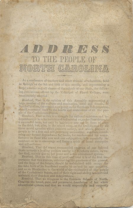 Lot of three imprints, includes: Address to the People of North Carolina, [Raleigh?, 1861?], 15pp. 8vo., signed in type by twelve North Carolina educators on the last page at a conference of teachers in Raleigh. A patriotic secessionist resolution supporting "the Cause": "Resolved. That this is a struggle for national existence and independence, it is to be maintained and carried on, under Providence, to a succesful issue not only by legislative acts and by force of arms, but also in the schoolroom...". Waterstained. Sold with: North Carolina Journal of Education, Sep., 1863, Vol. VI, No. 5, Greensborough, NC, 26pp. 8vo., printed by Sterling, Campbell and Albright for the Educational Association. A group of short stories, prose, and editorials aimed at educators. Some foxing. Sold with: North Carolina Journal of Education, March, 1863 (See above). Fine. Three pieces.