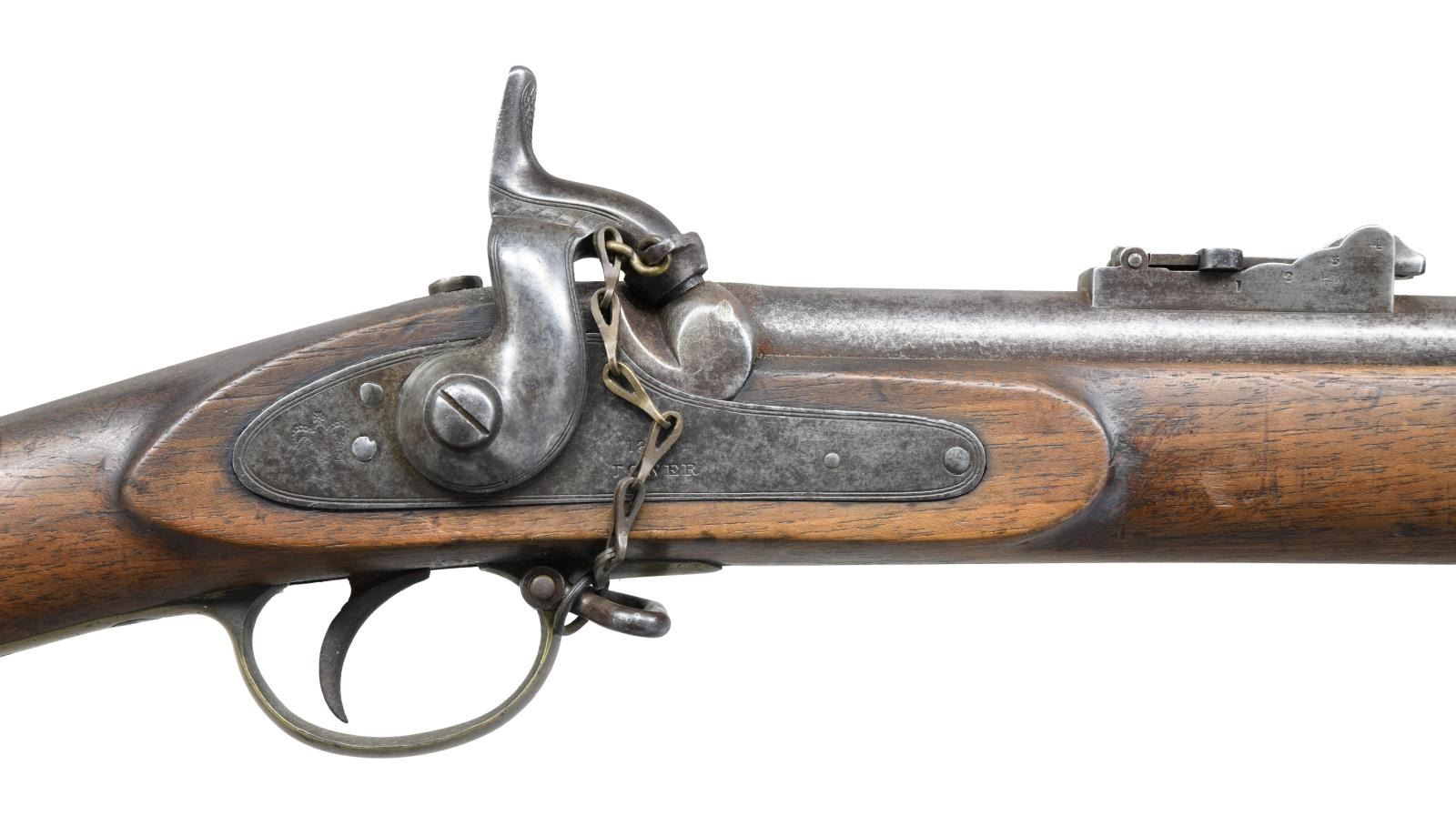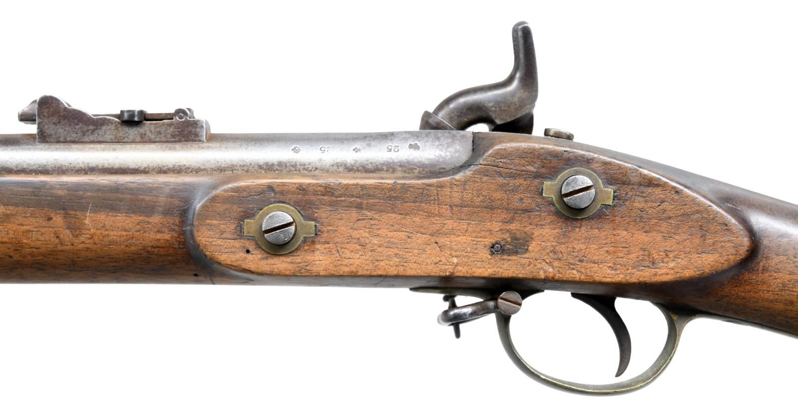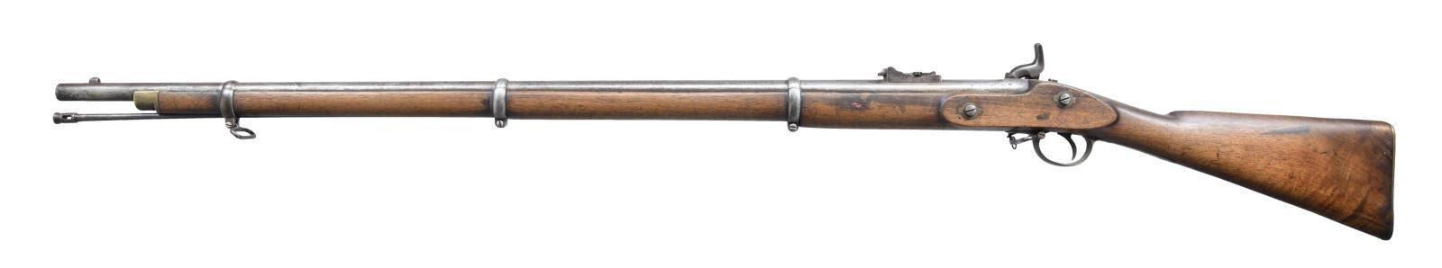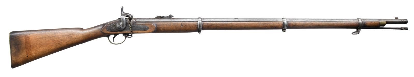 Cal. 577. NSN. Bbl. 40". Ladder rear sight graduated to 800yds. Blade front sight. Front of lock is marked "1863/TOWER". Rear of lock marked w/ crown. Top of nock form appears to be marked "T&LB". Right side of bbl. has British proofs & two "25" markings. Hardwood stock w/ bottom mounted sling swivels. Ramrod present. CONDITION: stock appears sanded w/ a small crack near recoil bolt, scattered handling wear & stains. Metal is mostly a dull gray patina w/ oxidation. Oxidized bore. (01-23722/MJC). ANTIQUE. $400-600.