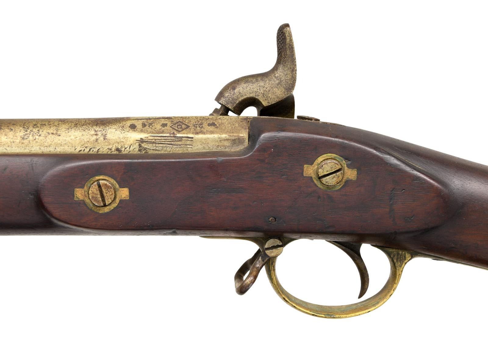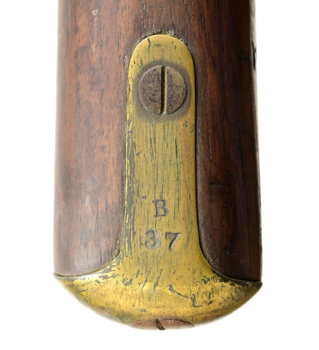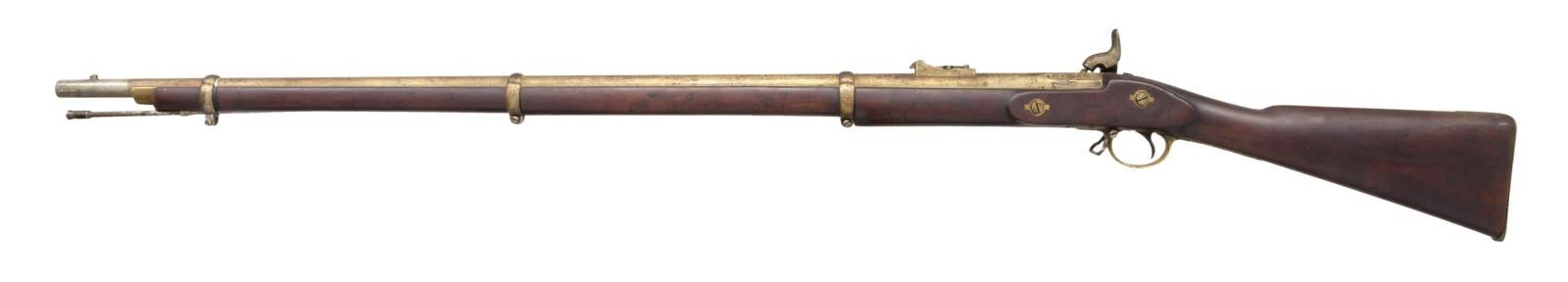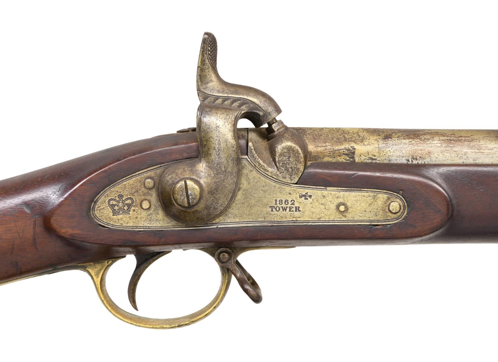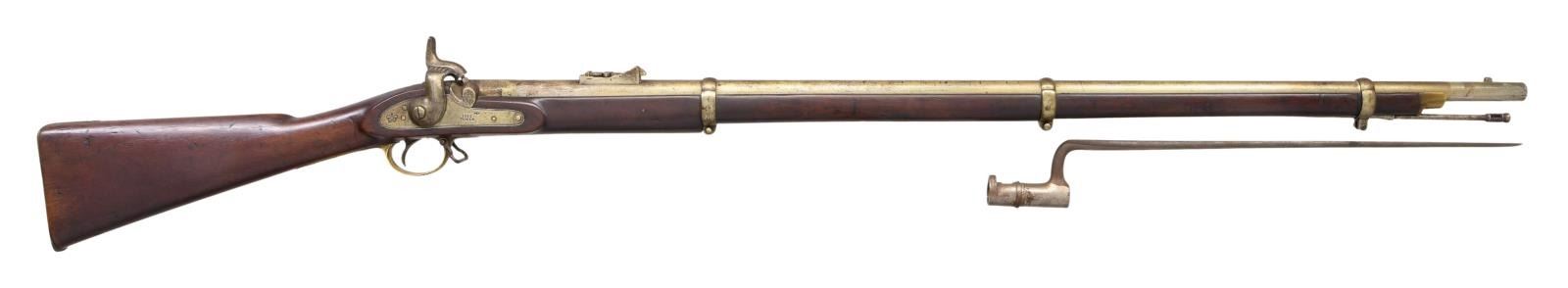 MUSKET. Cal. 58. NSN. Bbl. 40". Blade front sight. Ladder rear sight w/ indiscernible graduations. Lock has crown at rear & "1862 TOWER" marking at front. Left rear of bbl. has 24 & 25 proof markings. Brass recoil bolts, buttplate & triggerguard. Buttplate tang "B 37". Lock is functional when hand cycled. Hardwood stock w/ trigger guard mounted sling swivel. No front sling swivel present. Slotted ramrod is present. UNATTACHED ACCESSORIES: unmarked socket bayonet that measures 21" overall w/ 18" blade. Bayonet locks a ring & has a dull gray oxidized appearance overall. CONDITION: stock has softened edges w/ an older oil finish, a few drying cracks on butt, a few chips scattered dings & handling wear. Brass parts have a mustard yellow color w/ scattered oxidation & dings. Balance of metal has a dull gray appearance w/ some vise marks at rear of bbl. & oxidation throughout. Bore shows scattered oxidation & pitting but evident rifling. (01-25101/MJC). ANTIQUE. $800-1200.