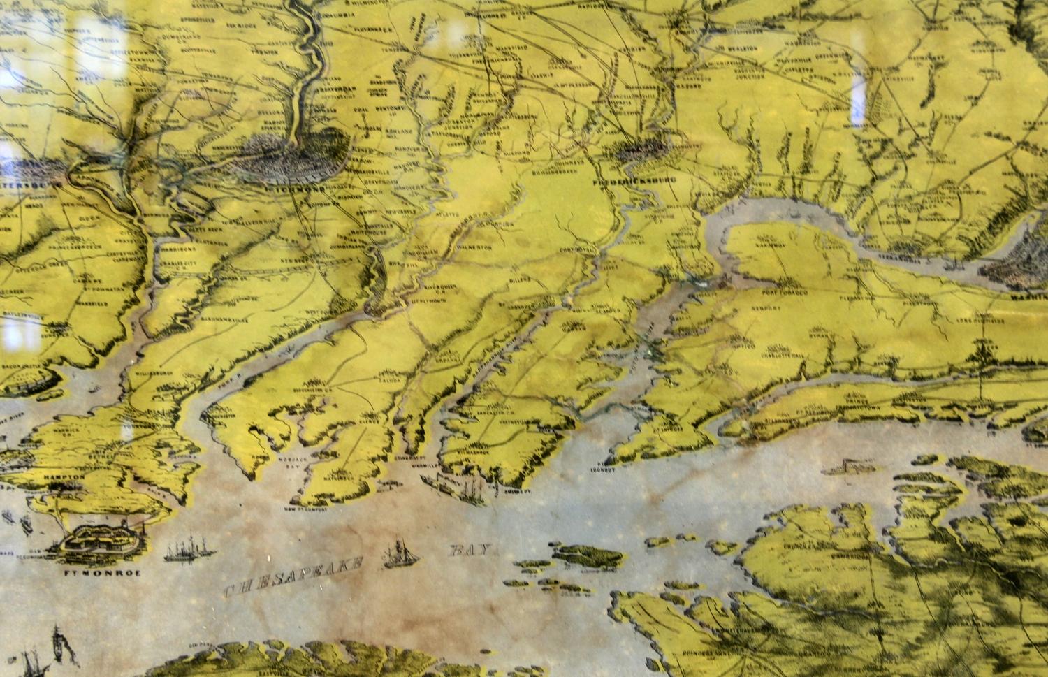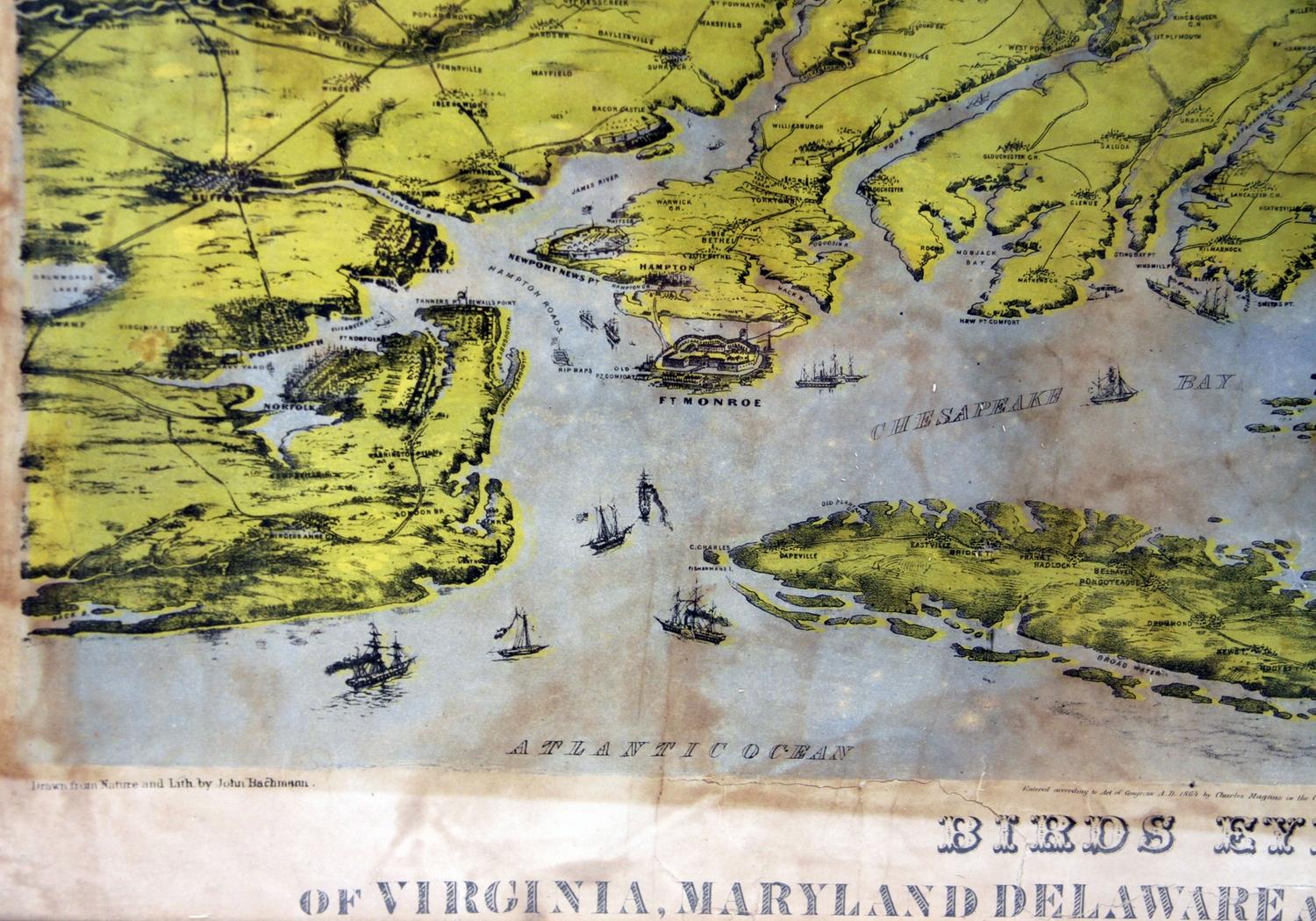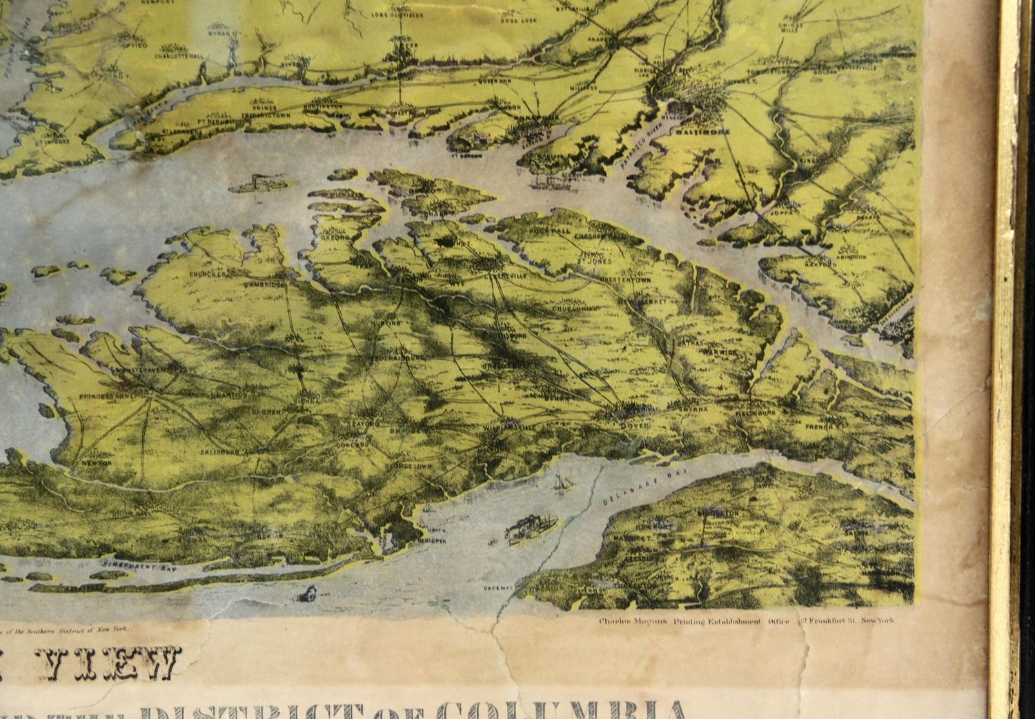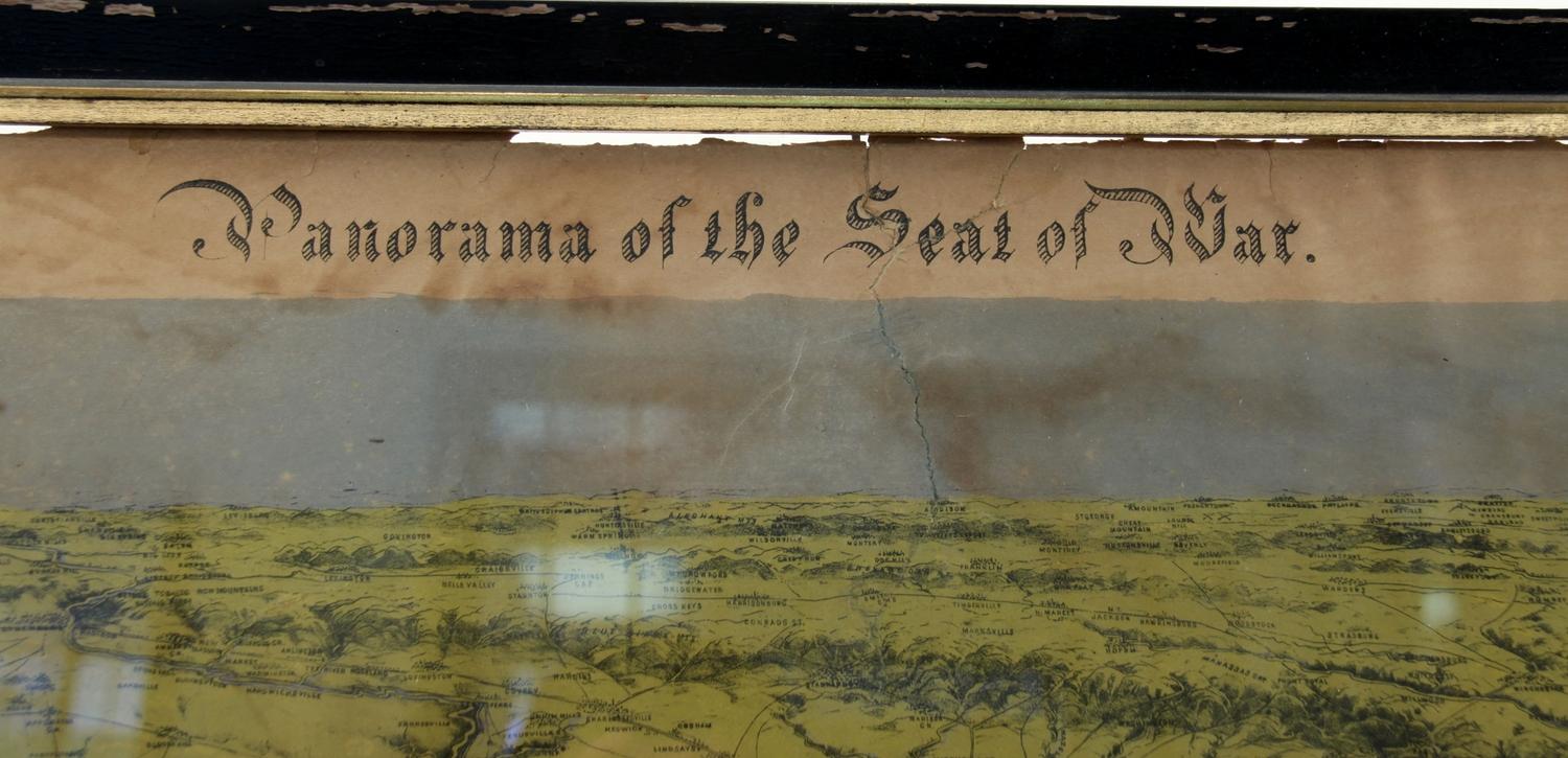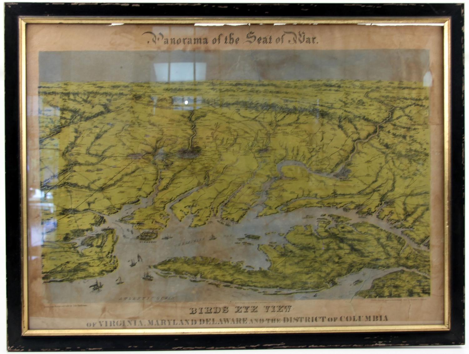 Framed 25x33 inch birds eye view Civil War era map of Virginia, Maryland, Delaware and the District of Columbia, by John Bachman, entitled "Panorama of the Seat of War". Under map reads "Drawn From Nature and Lith by John Bachman"; "Entered According to Act of Congress A.D. 1864 by Charles Magnus in the Clerks Office in Southern District of New York"; "Charles Magnus Printing Establishment Office Frankfort St New York". Overall good condition with some tearing and discoloration. Colors still vibrant.