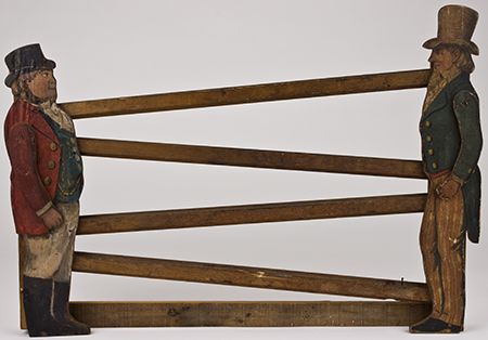 A superb example of mid-nineteenth century American folk art toys, a handmade rolling marble you expertly crafted from wood. The game features two standing male figures - one of whom resembles "Uncle Sam" with a series of slanted wood rods between them. The rods are scooped on the inside, allowing a marble to be placed and rolled down, exiting through a hole at the bottom. The figures have articulated arms and still bear the bright, although chipped, original paint. Measures 20 1/2" wide x 14" tall. Some wear to paint as expected, one small split to the rod at the bottom, otherwise in very good original condition. Excellent for display!