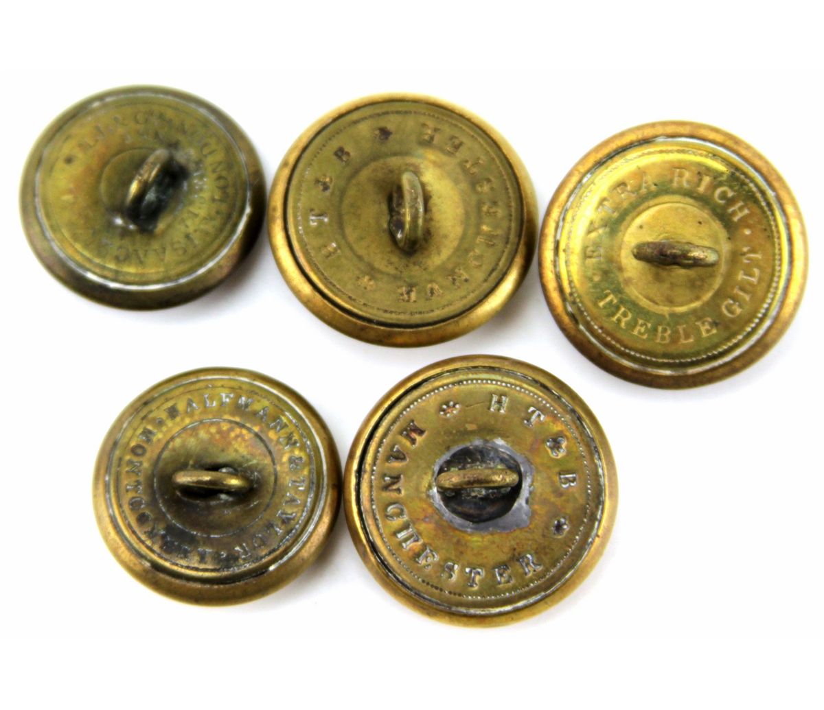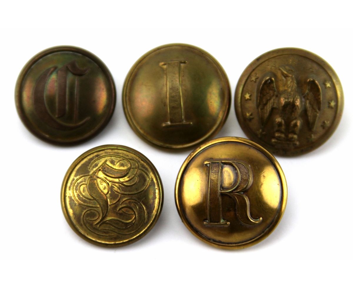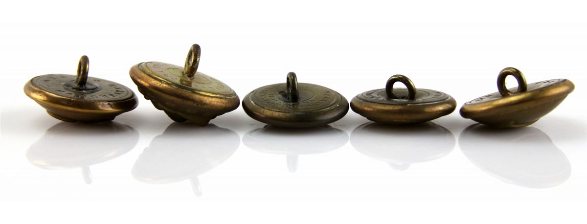 CIVIL WAR ERA CONFEDERATE STATES BUTTON LOT OF 5 English made Confederate Staff, HT&B Confederate Infantry, Isaacs Campbell & Co. Confederate Cavalry, Halfmann & Taylor Infantry, and HT&B Rifle buttons. Country: CSA Condition: Very good.