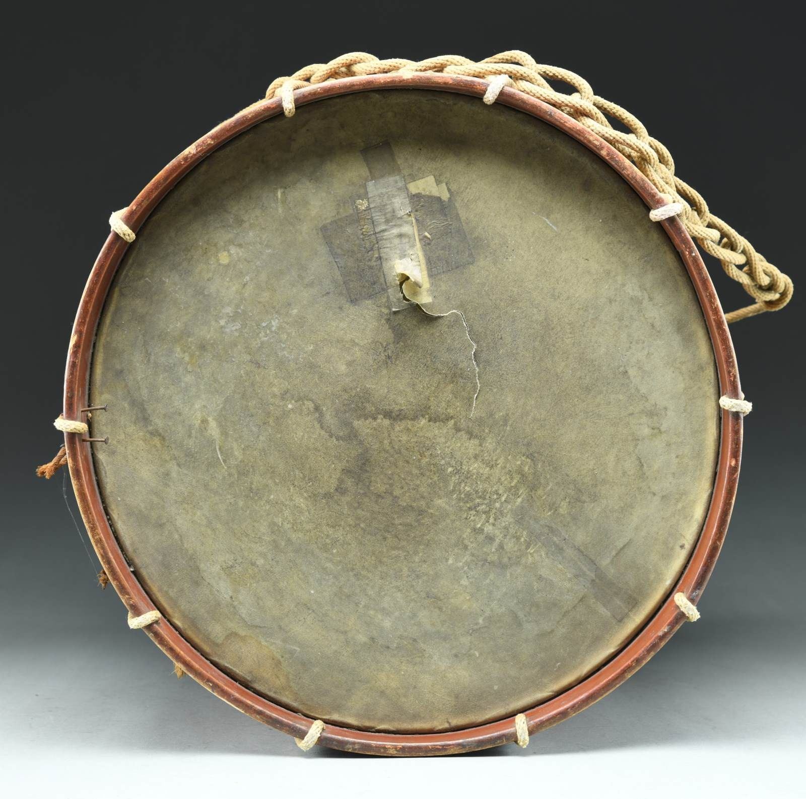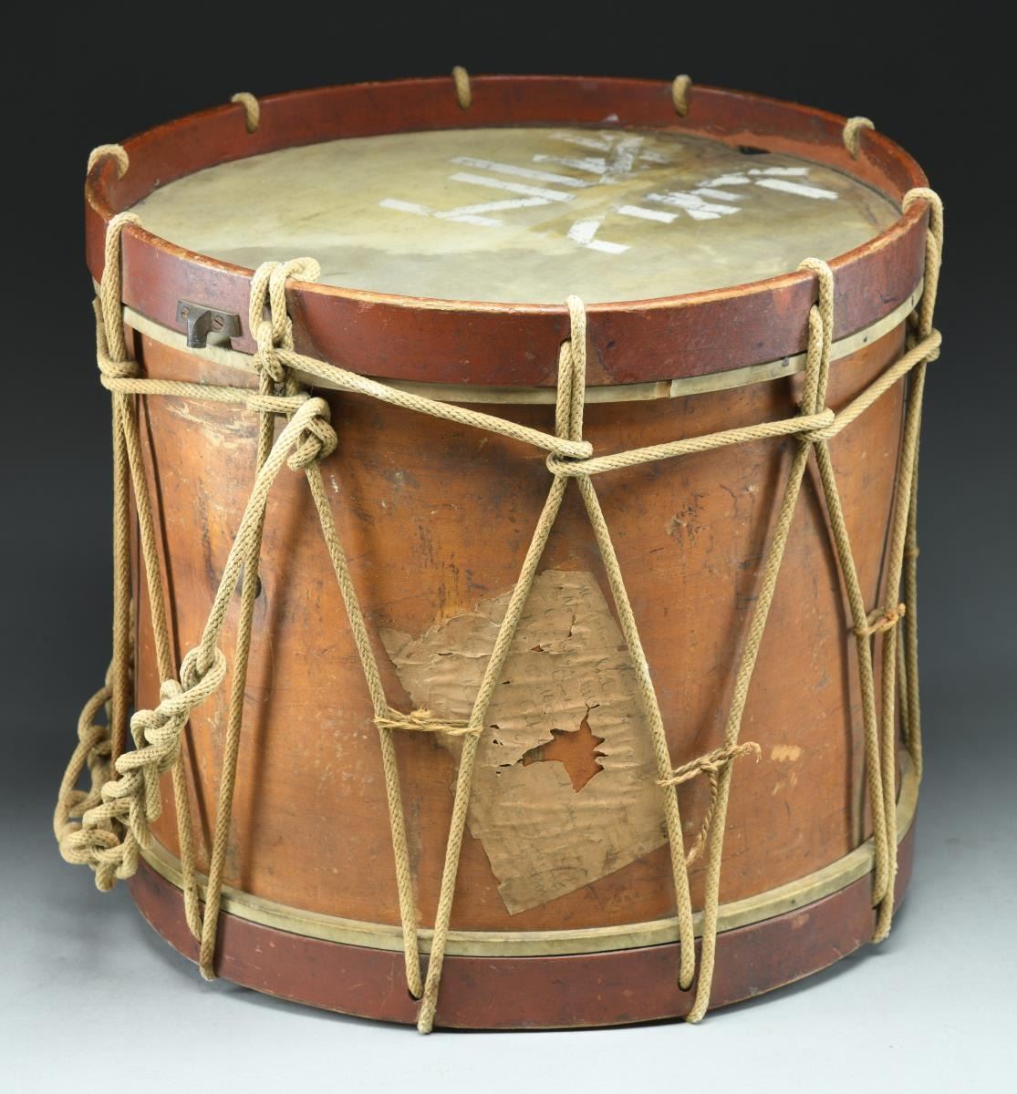 15.5" diameter, 14.5" height, "JACOB STEWART / MILITARY & TOY DRUMS / Pittsfield, Mass" label seen through vent with penciled date of 1861. There is a pasted label on body apparently listing songs with the first one being "Marching Through Georgia". CONDITION: good, sound & tight with exception of torn top head. (02-19959/JS). $300-400.
