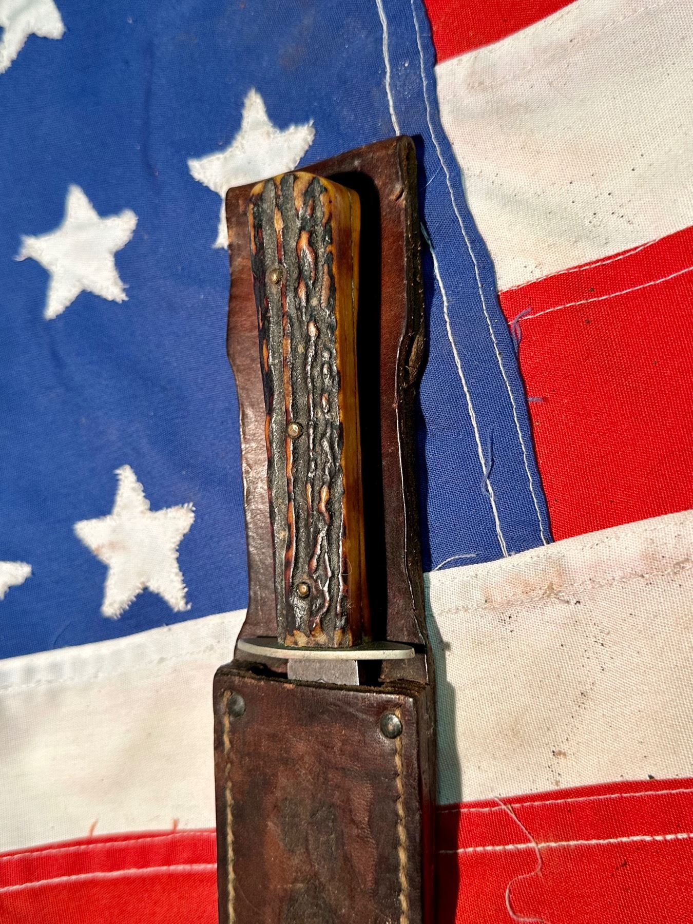 CIVIL WAR ERA J. RUSSELL ELK HANDLE KNIFE WITH SHEATH. IT IS IN MINT OVERALL SHAPE AND CONDITION WITH A BEAUTIFUL OVERALL PATINA. A GREAT FIND AND AN EXCELLENT ADDITION TO YOUR COLLECTION.
