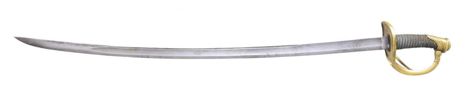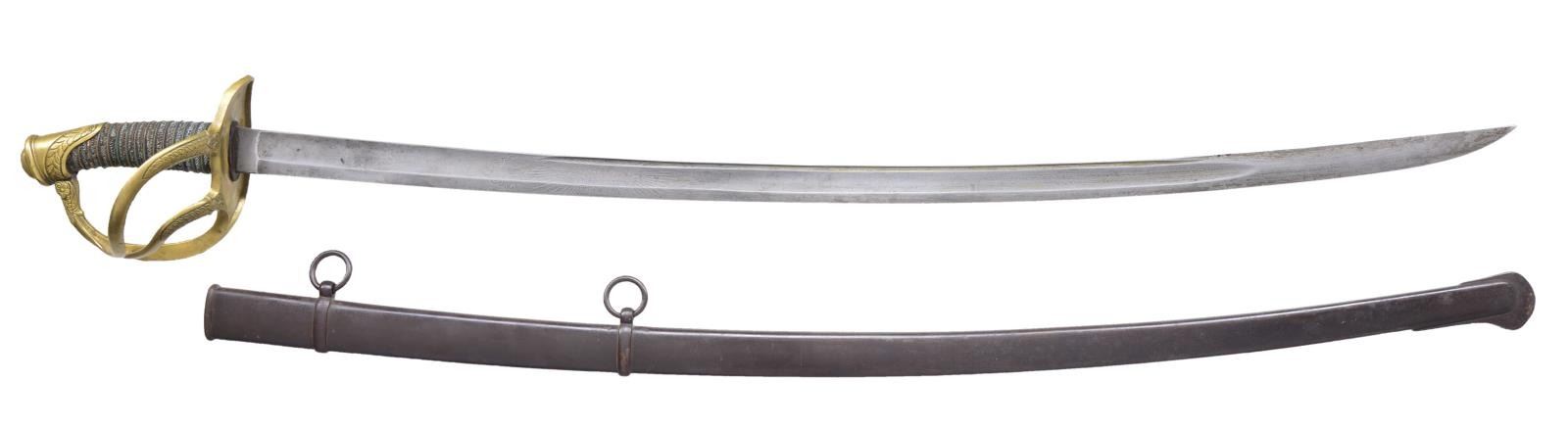 ASSOCIATED TINTYPE. Overall length: 41". Blade length: 34". Blade has a single wide fuller and a single 17" narrow fuller near the spine. The blade has a 6 1/2" etched panel on each side with 1 panel featuring a spread winged American eagle in glory and the other featuring "U S". The ricasso is stamped, "P. D. L." in a dotted oval which stands for Peter D. Luneschloss of Solingen, Prussia. This fine cavalry officer's saber was likely imported by Tiffany & Co. of New York. Gilded brass hilt with foliate embellishment on the 2 branches, the pommel and the quillon area. Wire wrapped sharkskin grip. Darkened iron scabbard. The tintype, according to family history, is of the owner of this sword. He is wearing an officer's cavalry shell jacket with lieutenant's shoulder straps. His kepi has early metal, false embroidered, crossed cavalry sabers on the front. In the photograph, he is clutching a circa 1840 infantry officer's sword, likely used as a prop by the photographer. This sword would be correct for the officer pictured in the tintype. CONDITION: the sword has a medium gray finish and the etching remains quite clear. Hilt shows areas of original gilding mixed with patinaed brass. Sharkskin grip shows some wear and is about 90% complete. Wire is worn but 100% present. Scabbard has 1 shallow dent near the drag along with a bit of scattered oxidation. The tintype remains quite clear. There is some verdigris on the mat. The case shows wear but is undamaged. (02-17424/BF). $2,000-3,000.