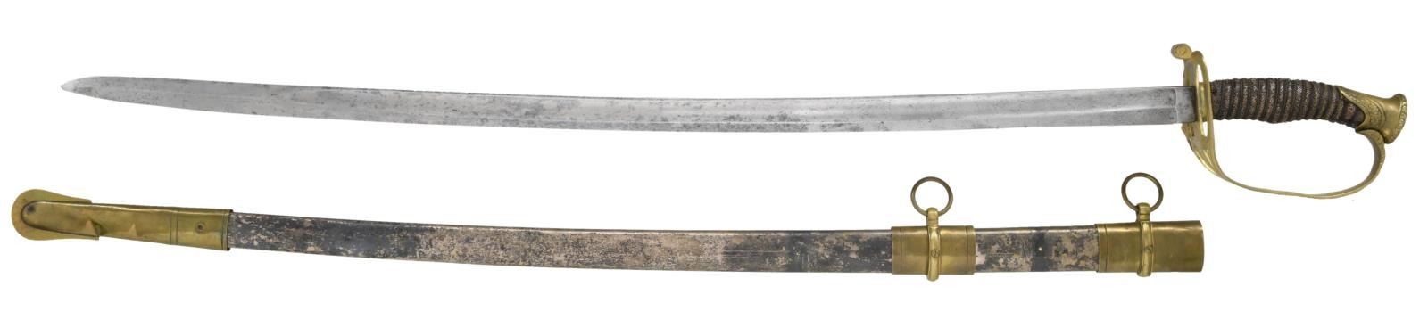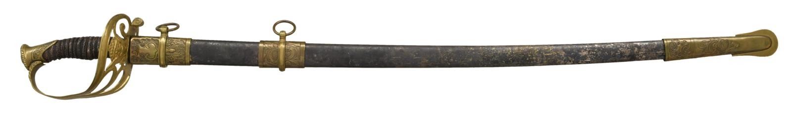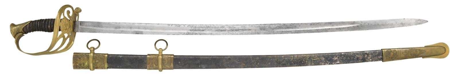 Overall length: 40 3/4". Blade length: 31 7/8". Blade has a single wide fuller and is etched over half its length with various military, patriotic & foliate motifs. The spine of the blade is etched "IRON PROOF". Gilded brass hilt with pierced semi-basket guard featuring a spread-wing American eagle with glory above. Linearly decorated knuckle bow with foliate decoration as it enters the pommel. Pommel has foliate & floral decoration on the front along with scrollwork stepped pommel cap. Wire-wrapped sharkskin grip. Gilded brass mounted iron scabbard with a darkened finish. Scabbard mounts are enhanced with floral & scroll engraving. CONDITION: blade has a medium gray mottled patina and the etching is a bit light. Hilt is a bit loose and slightly misshaped, but does have vestiges of original gilded finish. Grip shows wear and wire has become dislodged. Scabbard body retains mottled areas of original finish. Scabbard mounts show traces of original gilding. (02-19261/BF). $800-1,200.